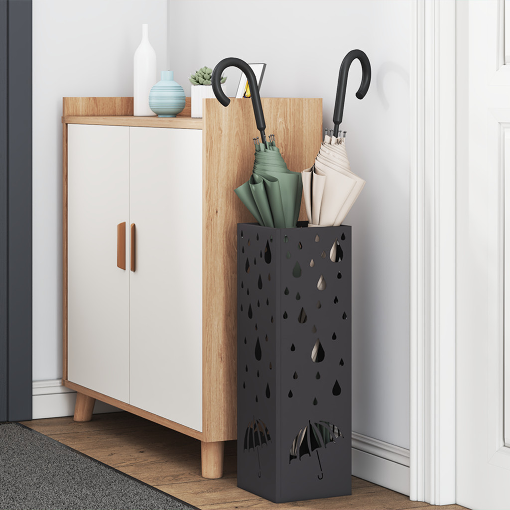 Ez az ernyőtartó egy menő kiegészítő minden előszobának. Okos, matt feketéje mellé remekül tartja az esernyőket. Számos méretű ernyőt elhelyezhetsz benne, így rendezett és stílusos marad a bejárat. A dekoratív minták kellemes atmoszférát adnak az otthonodnak. Tárolási képesség: Van egy dedikált rekesz a plusz cuccok tárolására, tökéletes a modern otthonokhoz. Stílusos dizájn: A sima fekete felület és a menő minta jól illeszkedik a kortárs dekorációhoz, elegáns megjelenést adva bármilyen helynek. Helytakarékos: A téglalap alakja pontosan illik a szűk helyekhez, lehetővé téve, hogy okosan használd a kicsi előszobákat. Tartósság: Minőségi fém, masszív és tartós, ideális választás az otthonodhoz. Könnyen tisztítható: A matt felület gondozása egyszerű; csak töröld át egy nedves ruhával, hogy mindig csinos maradjon.
