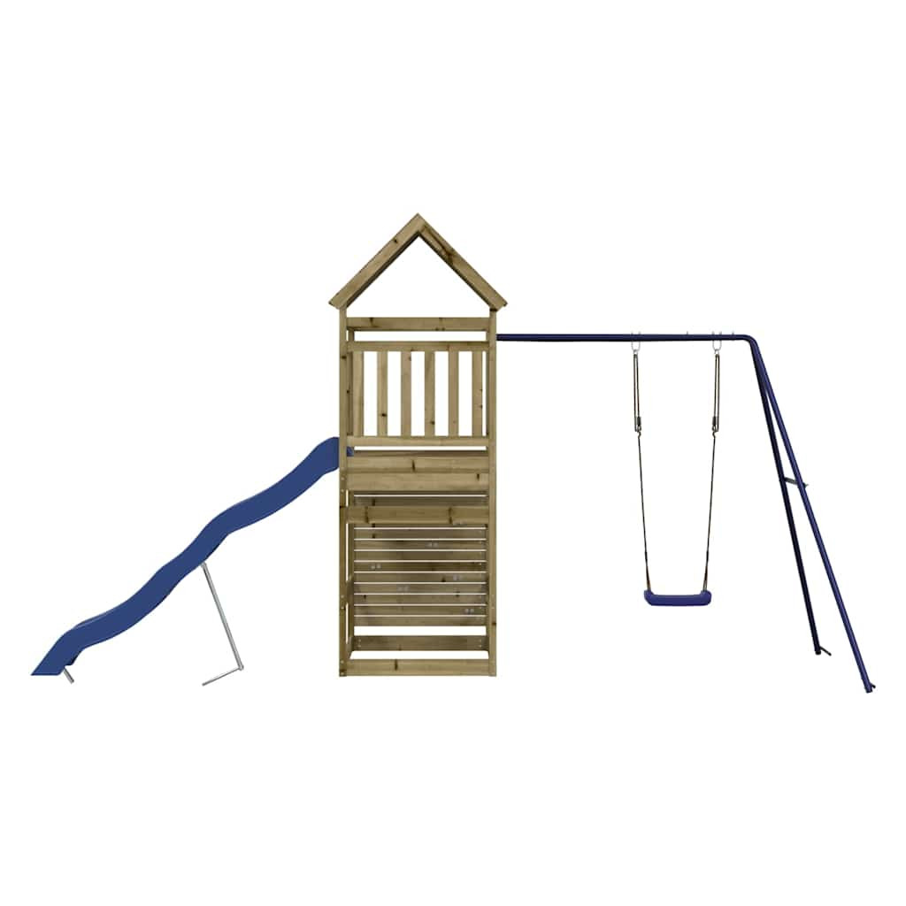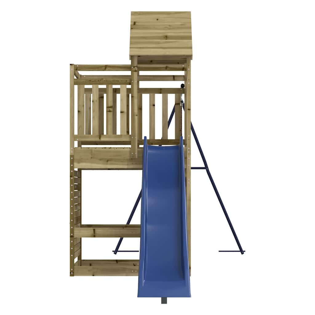 Szeretné, ha gyermekei szabadon játszhatnának otthon? Ez a fából készült játszószett varázslatos kalandok játszóterévé varázsolja kertjét! Impregnált fa: Ez a kerti mászóka vákuumnyomással impregnált fenyőfából készült. A tömör fenyőfa egy gyönyörű, természetes anyag. A fenyőfa egyenes erezetű, a csomók pedig jellegzetes, rusztikus megjelenést biztosítanak az anyagnak. Az impregnálás egy tartósítási eljárás, amely egy zárt, túlnyomásos berendezés használatával történik. A nyomáskezelés növeli a korhadással és a vízzel szembeni ellenállást.Erős és stabil váz: A játszószett fa váza erős szerkezetet és stabilitást biztosít. Emellett a gyerekhinta "A" alakú lábai lehetővé teszik az egyensúlyozást.Multi-aktivitási központ: A játszótérelem 118 cm magas emelvénnyel, valamint sziklafallal, hullámos csúszdával, hintaszettel és homokozóval rendelkezik. A kicsik barátaikat is meghívhatják játszani. Átgondolt kialakítás: A környező fa korlátokat úgy tervezték, hogy biztosítsák a gyermekek biztonságát játszás közben. Ezenkívül a fa tető árnyékot biztosít gyermekeinek a forró nyári napokon.Végtelen szórakozás: Ez a rengeteg szórakozást kínáló, fából készült játszószett tökéletes arra, hogy gyermekei és barátaik szórakozzanak, több interaktív időt töltsenek együtt, és emlékeket szerezzenek! Figyelem:Csak háztartási használatraKültéri használatra3 évesnél kisebb gyermekek számára nem alkalmasAjánlott életkor: 3-8 év Figyelem. 3 év alatti gyermekek számára nem alkalmas. Csak háztartási használatra.
