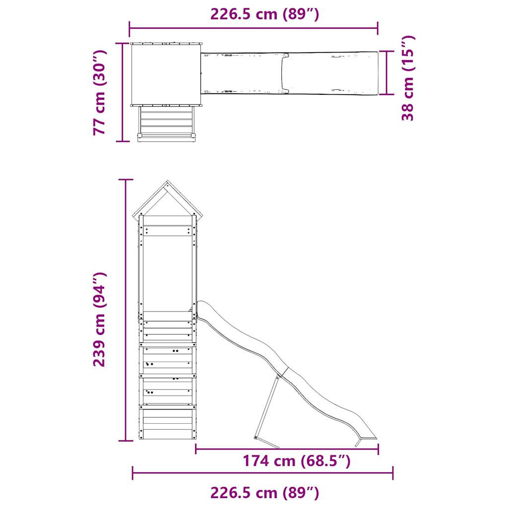 Szeretné, ha gyermekei szabadon játszhatnának otthon? Ez a fából készült játszószett varázslatos kalandok játszóterévé varázsolja kertjét! Tartós anyag: Ez a mászóka vákuumnyomással impregnált fenyőfából készült. A tömör fenyőfa az erősségéről és tartósságáról ismert. Egyenes erezete és jellegzetes csomói hozzájárulnak rusztikus varázsához. Konzerváló oldattal impregnálták, és autokláv kezelésen esett át, így megnőtt az ellenálló képessége a bomlással és az időjárási viszontagságokkal szemben.Stabil fa váz: A kerti játszóház faváza erős szerkezetet és stabilitást biztosít.Multi-aktivitási központ: A mászóka a 118 cm magas emelvény mellett hullámos csúszdával és homokozóval rendelkezik. A kicsik barátaikat is meghívhatják játszani.Átgondolt kialakítás: A környező fa korlátokat úgy tervezték, hogy biztosítsák a gyermekek biztonságát játszás közben. Ezenkívül a felhőmintás tető árnyékot nyújt a gyerekeknek a forró nyári napokon.Végtelen szórakozás: Ez a rengeteg szórakozást kínáló, fából készült kültéri játszószett tökéletes arra, hogy gyermekei és barátaik szórakozzanak, több interaktív időt töltsenek együtt, és emlékeket szerezzenek! Figyelem:Csak háztartási használatraKültéri használatra3 évesnél kisebb gyermekek számára nem alkalmasAjánlott életkor: 3-8 év Figyelem. 3 év alatti gyermekek számára nem alkalmas. Csak háztartási használatra.