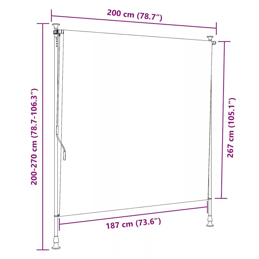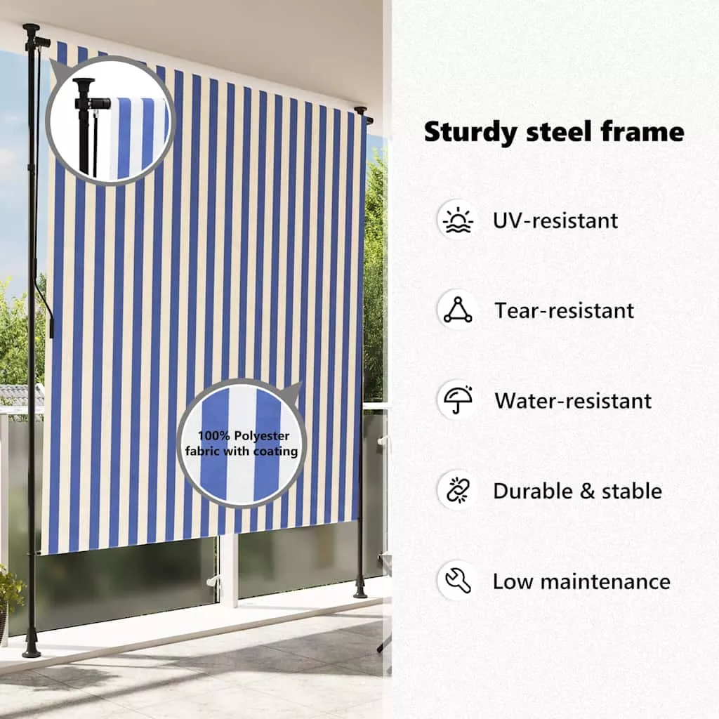 Élvezzen egy hűsítő italt, pár finom falatot vagy beszélgessen egy jót teraszán a barátaival, miközben e kültéri roló mögött pihen! Tartós anyag: A napellenző váz acélból készült, amely robusztus és tartós. A PU felületkezeléssel ellátott szövet UV-álló. Óvja családját vagy vendégeit az UV-sugárzástól és a vakító napfénytől. Behúzható funkció: A fogantyú hajtókarnak köszönhetően az árnyékoló roló behúzható, hogy megfeleljen az Ön különböző igényeinek. Kihúzva hűsítő árnyékot nyújt, összehúzva pedig nem akadályozza a kilátást. Állítható magasság: A tartórudak magassága 225-275 cm között állítható, így több mennyezet magassághoz igazodik. Széleskörű alkalmazás: A kültéri árnyékoló egyszerű és stílusos kialakítású, amely jól illeszkedik otthoni vagy kereskedelmi környezetébe. Különféle helyekre alkalmas, például erkélyre, teraszra, udvarra, éttermekbe, kávézókba, üzletekbe stb.