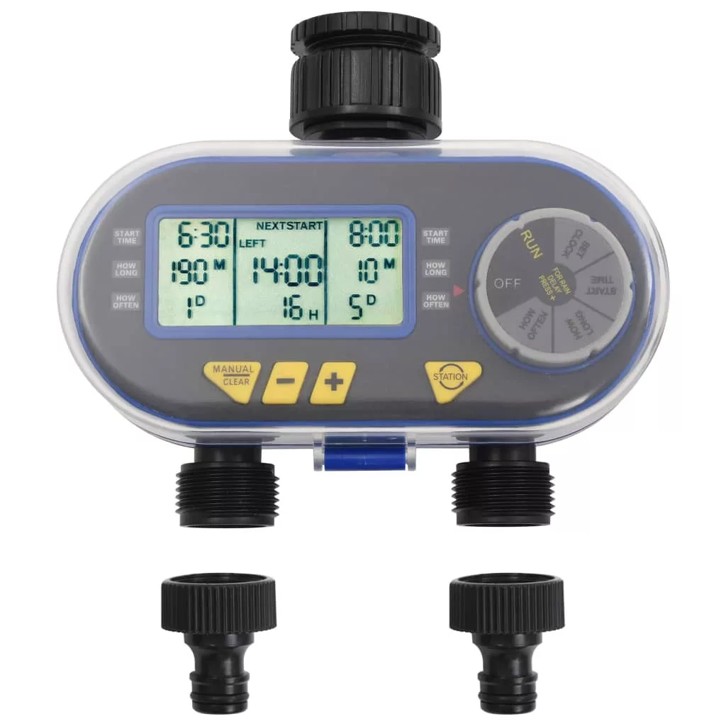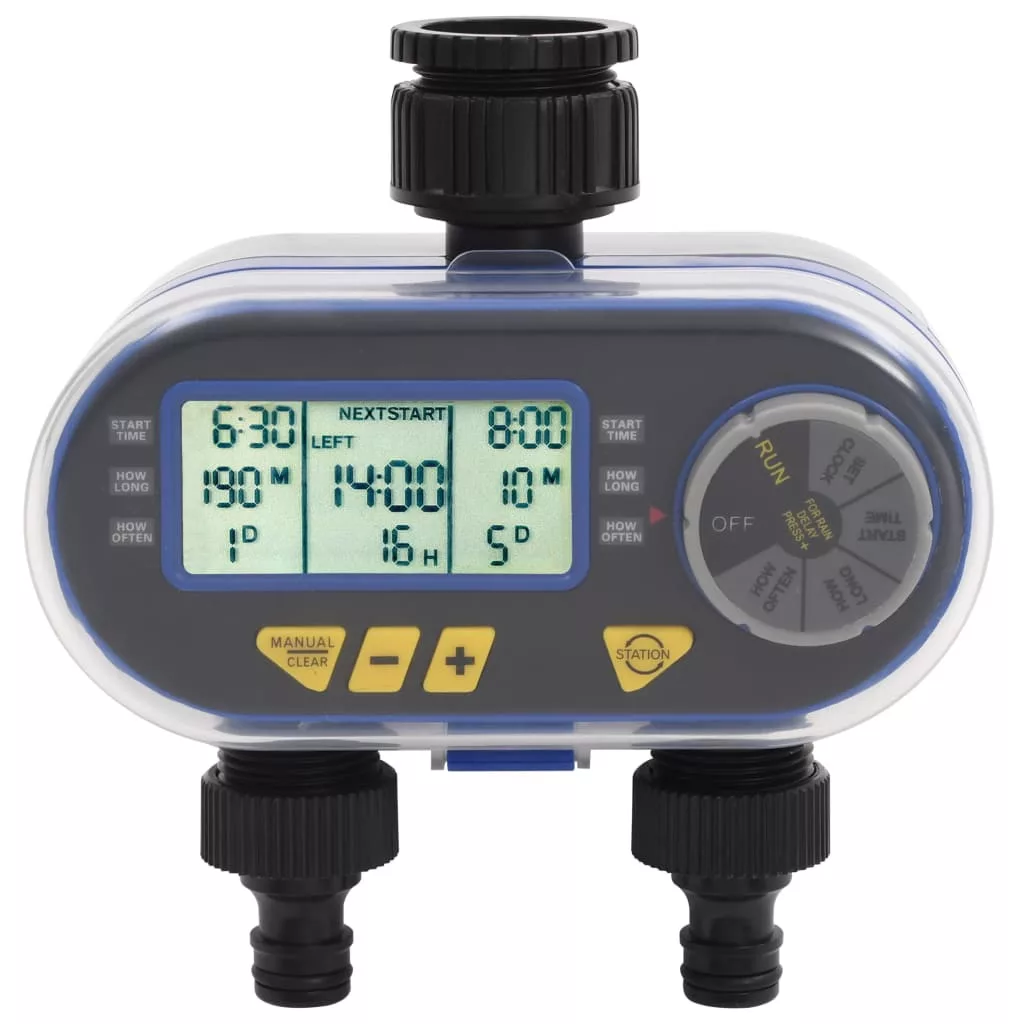 Alakítsa kerti csapját beprogramozott öntözőrendszerré digitális öntözőautomatánkkal! Ez a kétutas öntözőóra megoldja Ön helyett a növények öntözését, függetlenül attól, hogy csak bizonyos napokon, vagy néhány naponta szeretné meglocsolni őket, így ideális gyepje, kertje, udvara, melegháza, ágyása stb. öntözésére. Ez a digitális öntözésidőzítő két szolenoidszeleppel lett ellátva, és számos különböző módon beállítható. Kössön rá két locsolócsövet, és állítsa be egyenként az öntözés időtartamát és gyakoriságát igényeinek megfelelően. Ráadásul a késleltető funkciónak köszönhetően esős napok közben és után könnyedén kihagyhatja az öntözéseket a beprogramozott öntözési ciklusok átállítása nélkül. Ezt az időzítőt csak kültéri használatra tervezték öntözőberendezések vagy öntözőrendszerek vezérlésére. A berendezés nem használható ipari célokra, például élelmiszerekre, vegyszerekre és növényvédő szerekre.
