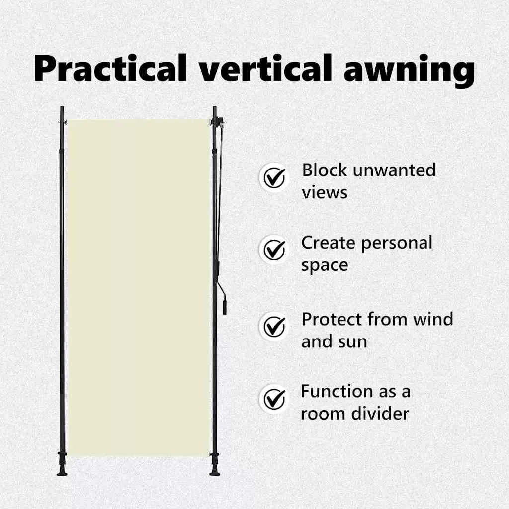 Növelje privát szféráját és egyben biztosítsa erkélye, tornáca vagy lugasa árnyékolását ezzel a redőnnyel. A poliamid bevonattal ellátott kiváló minőségű anyag fakulásálló és védelmet nyújt a nap káros sugaraival szemben, miközben légáteresztő-képességét is megtartja. Könnyen fel- és letekerhető a kézi karral. Ez a függőleges redőny két álló állvánnyal rendelkezik, melyek magassága 2 és 3 m között állítható. A legtöbb mennyezetmagasság esetében használható, és könnyen felszerelhető. A kültéri redőnyt könnyű összeszerelni.