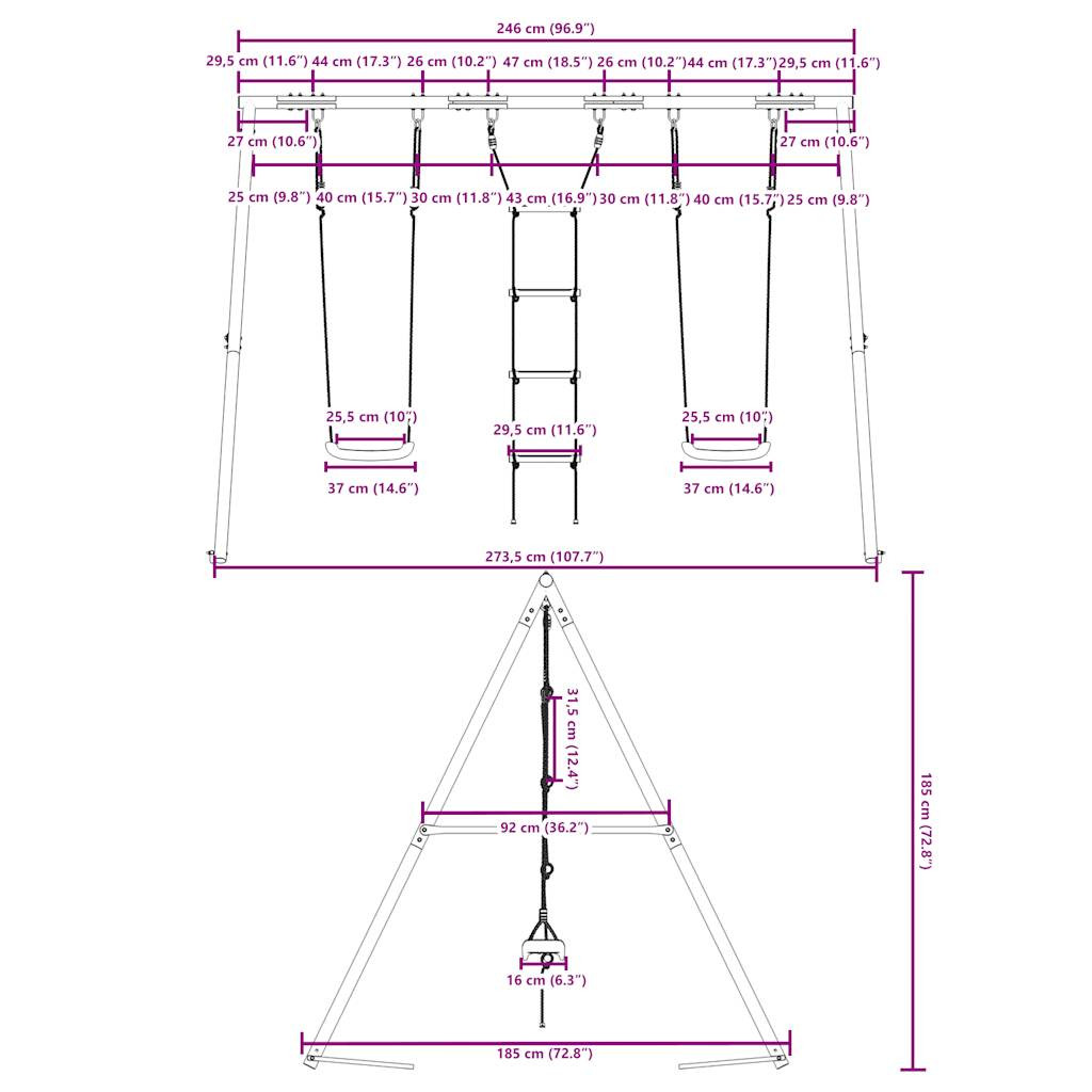 Varázsolja kertjét gyerekei játszóterévé ezzel a kültéri hinta szettel! Szórakoztató foglalkoztatóközpont: Ez a gyermekhintaszett 2 különböző játéklehetőséget tartalmaz két hintaüléssel és egy mászólétrával. Így a gyerekek kedvükre hintázhatnak és mászhatnak.Nagy teherbírású fém váz: Ez a hintaváz festett acélcsövekből készült, amelyek rozsdaállók, rendkívül erősek, és ellenállnak a deformációnak, kiváló stabilitást és tartósságot biztosítva. Az A-alakú szerkezet erős támaszt nyújt, ingadozás nélkül.Állítható hintaülés: Ezt a kerti hintát úgy tervezték, hogy gyermekével együtt növekedjen, így kisgyermekek és növekvő gyerekek számára egyaránt alkalmas. A kötélhossz beállításával könnyedén alkalmazkodhat gyermeke változó igényeihez.Multifunkcionális szabadtéri játékok gyerekeknek: Ez a kerti hinta szett segít a gyerekeknek fejleszteni egyensúlyukat, koordinációjukat, mozgékonyságukat, erejüket, és állóképességüket, miközben változatos játék- és testmozgást biztosít.Széleskörű felhasználás: Ez a hintaváz különféle helyeken helyezhető el, például kertben, hátsó udvaron, óvodában, játszótéren stb. Jó tudni:A biztonság kedvéért ügyeljen arra, hogy a hinta egyszerre csak egy gyermek számára legyen elérhető. Figyelem. 3 év alatti gyermekek számára nem alkalmas. Csak háztartási használatra.