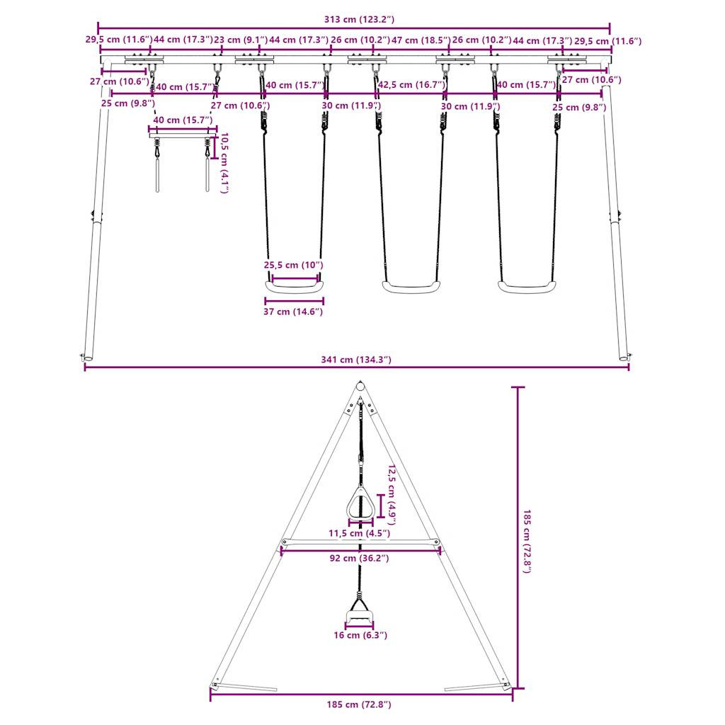 Varázsolja kertjét gyerekei játszóterévé ezzel a kültéri hinta szettel! Szórakoztató foglalkoztatóközpont: Ez a gyermekhintaszett 2 különböző játéklehetőséget tartalmaz három hintaüléssel és egy tornagyűrűkkel ellátott trapézzal. Így a gyerekek kedvükre hintázhatnak és mászhatnak.Nagy teherbírású fém váz: Ez a hintaváz festett acélcsövekből készült, amelyek rozsdaállók, rendkívül erősek, és ellenállnak a deformációnak, kiváló stabilitást és tartósságot biztosítva. Az A-alakú szerkezet erős támaszt nyújt, ingadozás nélkül.Állítható hintaülés: Ezt a kerti hintát úgy tervezték, hogy gyermekével együtt növekedjen, így kisgyermekek és növekvő gyerekek számára egyaránt alkalmas. A kötélhossz beállításával könnyedén alkalmazkodhat gyermeke változó igényeihez.Multifunkcionális szabadtéri játékok gyerekeknek: Ez a kerti hinta szett segít a gyerekeknek fejleszteni egyensúlyukat, koordinációjukat, mozgékonyságukat, erejüket, és állóképességüket, miközben változatos játék- és testmozgást biztosít.Széleskörű felhasználás: Ez a hintaváz különféle helyeken helyezhető el, például kertben, hátsó udvaron, óvodában, játszótéren stb. Jó tudni:A biztonság kedvéért ügyeljen arra, hogy a hinta egyszerre csak egy gyermek számára legyen elérhető. Figyelem. 3 év alatti gyermekek számára nem alkalmas. Csak háztartási használatra.