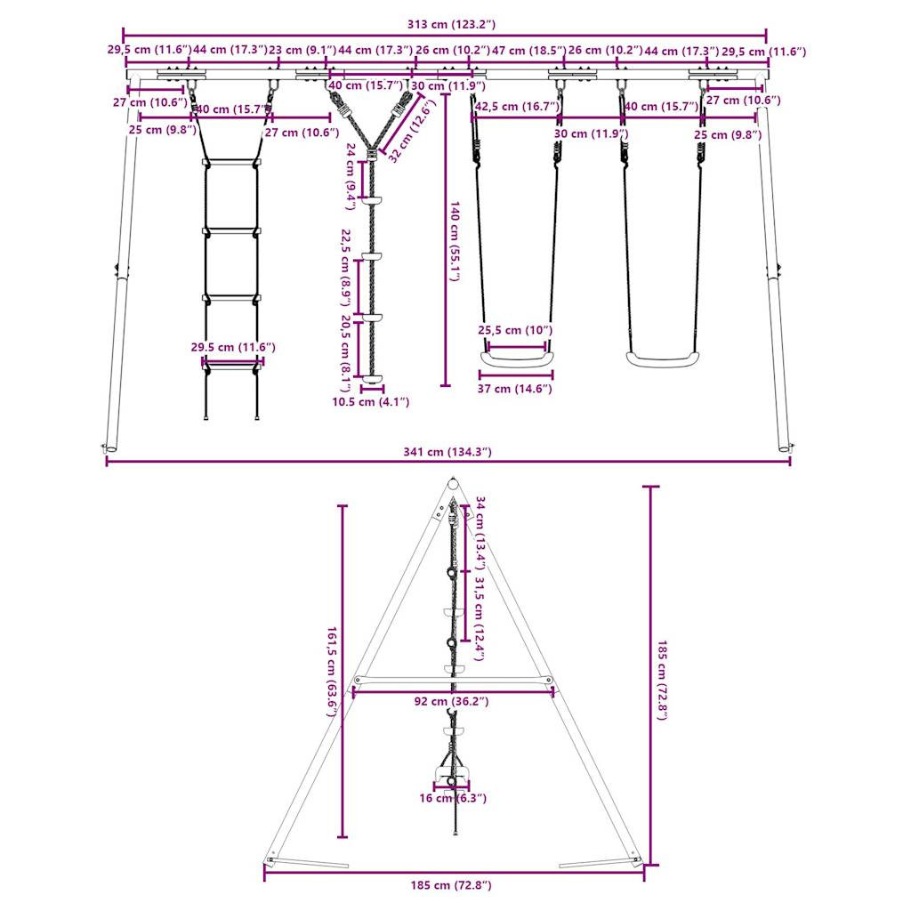 Varázsolja kertjét gyerekei játszóterévé ezzel a kültéri hinta szettel! Szórakoztató foglalkoztatóközpont: Ez a gyermekhintaszett 3 különböző játéklehetőséget tartalmaz két hintaüléssel, tárcsákkal ellátott kötélhintával, és mászólétrával. Így a gyerekek kedvükre hintázhatnak és mászhatnak.Nagy teherbírású fém váz: Ez a hintaváz festett acélcsövekből készült, amelyek rozsdaállók, rendkívül erősek, és ellenállnak a deformációnak, kiváló stabilitást és tartósságot biztosítva. Az A-alakú szerkezet erős támaszt nyújt, ingadozás nélkül.Állítható hintaülés: Ezt a kerti hintát úgy tervezték, hogy gyermekével együtt növekedjen, így kisgyermekek és növekvő gyerekek számára egyaránt alkalmas. A kötélhossz beállításával könnyedén alkalmazkodhat gyermeke változó igényeihez.Multifunkcionális szabadtéri játékok gyerekeknek: Ez a kerti hinta szett segít a gyerekeknek fejleszteni egyensúlyukat, koordinációjukat, mozgékonyságukat, erejüket, és állóképességüket, miközben változatos játék- és testmozgást biztosít.Széleskörű felhasználás: Ez a hintaváz különféle helyeken helyezhető el, például kertben, hátsó udvaron, óvodában, játszótéren stb. Jó tudni:A biztonság kedvéért ügyeljen arra, hogy a hinta egyszerre csak egy gyermek számára legyen elérhető. Figyelem. 3 év alatti gyermekek számára nem alkalmas. Csak háztartási használatra.