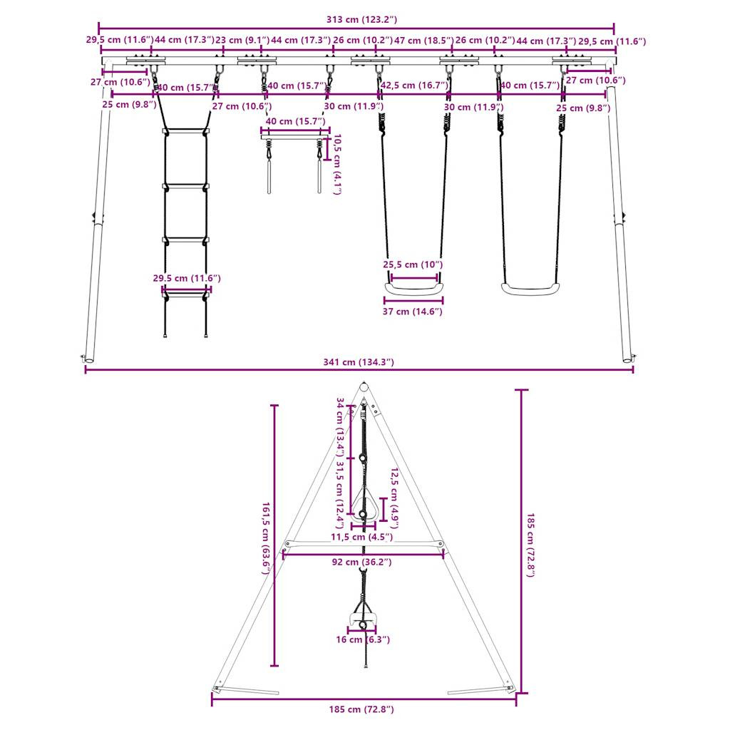 Varázsolja kertjét gyerekei játszóterévé ezzel a kültéri hinta szettel! Szórakoztató foglalkoztatóközpont: Ez a gyermekhintaszett 3 különböző játéklehetőséget tartalmaz két hintaüléssel, mászólétrával, és tornagyűrűkkel ellátott trapézzal. Így a gyerekek kedvükre hintázhatnak és mászhatnak.Nagy teherbírású fém váz: Ez a hintaváz festett acélcsövekből készült, amelyek rozsdaállók, rendkívül erősek, és ellenállnak a deformációnak, kiváló stabilitást és tartósságot biztosítva. Az A-alakú szerkezet erős támaszt nyújt, ingadozás nélkül.Állítható hintaülés: Ezt a kerti hintát úgy tervezték, hogy gyermekével együtt növekedjen, így kisgyermekek és növekvő gyerekek számára egyaránt alkalmas. A kötélhossz beállításával könnyedén alkalmazkodhat gyermeke változó igényeihez.Multifunkcionális szabadtéri játékok gyerekeknek: Ez a kerti hinta szett segít a gyerekeknek fejleszteni egyensúlyukat, koordinációjukat, mozgékonyságukat, erejüket, és állóképességüket, miközben változatos játék- és testmozgást biztosít.Széleskörű felhasználás: Ez a hintaváz különféle helyeken helyezhető el, például kertben, hátsó udvaron, óvodában, játszótéren stb. Jó tudni:A biztonság kedvéért ügyeljen arra, hogy a hinta egyszerre csak egy gyermek számára legyen elérhető. Figyelem. 3 év alatti gyermekek számára nem alkalmas. Csak háztartási használatra.