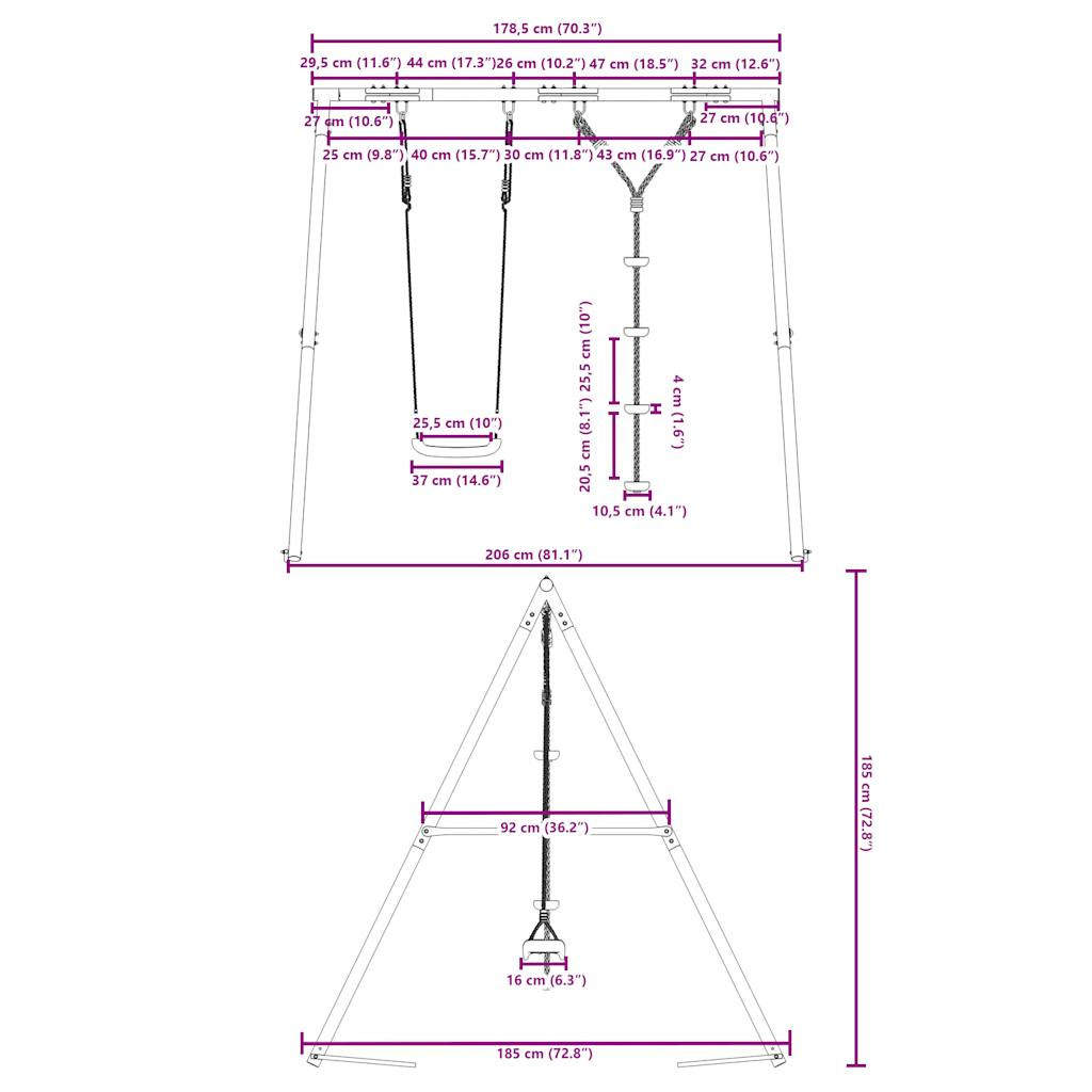 Varázsolja kertjét gyerekei játszóterévé ezzel a kültéri hinta szettel! Szórakoztató foglalkoztatóközpont: Ez a gyermekhintaszett 2 különböző játéklehetőséget tartalmaz hintaüléssel és tárcsákkal ellátott kötélhintával. Így a gyerekek kedvükre hintázhatnak és mászhatnak.Nagy teherbírású fém váz: Ez a hintaváz festett acélcsövekből készült, amelyek rozsdaállók, rendkívül erősek, és ellenállnak a deformációnak, kiváló stabilitást és tartósságot biztosítva. Az A-alakú szerkezet erős támaszt nyújt, ingadozás nélkül.Állítható hintaülés: Ezt a kerti hintát úgy tervezték, hogy gyermekével együtt növekedjen, így kisgyermekek és növekvő gyerekek számára egyaránt alkalmas. A kötélhossz beállításával könnyedén alkalmazkodhat gyermeke változó igényeihez.Multifunkcionális szabadtéri játékok gyerekeknek: Ez a kerti hinta szett segít a gyerekeknek fejleszteni egyensúlyukat, koordinációjukat, mozgékonyságukat, erejüket, és állóképességüket, miközben változatos játék- és testmozgást biztosít.Széleskörű felhasználás: Ez a hintaváz különféle helyeken helyezhető el, például kertben, hátsó udvaron, óvodában, játszótéren stb. Jó tudni:A biztonság kedvéért ügyeljen arra, hogy a hinta egyszerre csak egy gyermek számára legyen elérhető. Figyelem. 3 év alatti gyermekek számára nem alkalmas. Csak háztartási használatra.