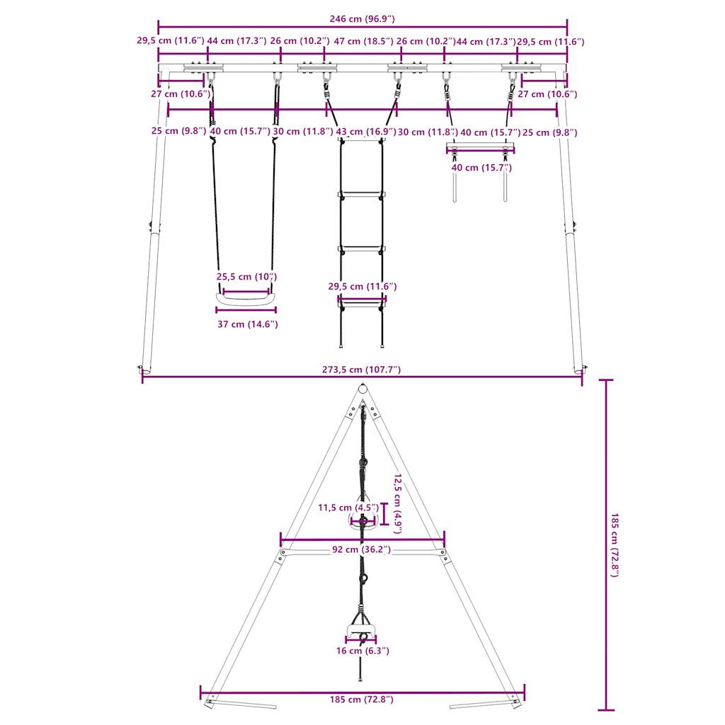 Varázsolja kertjét gyerekei játszóterévé ezzel a kültéri hinta szettel! Szórakoztató foglalkoztatóközpont: Ez a gyermekhintaszett 3 különböző játéklehetőséget tartalmaz hintaüléssel, mászólétrával és tornagyűrűkkel ellátott trapézrúddal. Így a gyerekek kedvükre hintázhatnak és mászhatnak.Nagy teherbírású fém váz: Ez a hintaváz festett acélcsövekből készült, amelyek rozsdaállók, rendkívül erősek, és ellenállnak a deformációnak, kiváló stabilitást és tartósságot biztosítva. Az A-alakú szerkezet erős támaszt nyújt, ingadozás nélkül.Állítható hintaülés: Ezt a kerti hintát úgy tervezték, hogy gyermekével együtt növekedjen, így kisgyermekek és növekvő gyerekek számára egyaránt alkalmas. A kötélhossz beállításával könnyedén alkalmazkodhat gyermeke változó igényeihez.Multifunkcionális szabadtéri játékok gyerekeknek: Ez a kerti hinta szett segít a gyerekeknek fejleszteni egyensúlyukat, koordinációjukat, mozgékonyságukat, erejüket, és állóképességüket, miközben változatos játék- és testmozgást biztosít.Széleskörű felhasználás: Ez a hintaváz különféle helyeken helyezhető el, például kertben, hátsó udvaron, óvodában, játszótéren stb. Jó tudni:A biztonság kedvéért ügyeljen arra, hogy a hinta egyszerre csak egy gyermek számára legyen elérhető. Figyelem. 3 év alatti gyermekek számára nem alkalmas. Csak háztartási használatra.