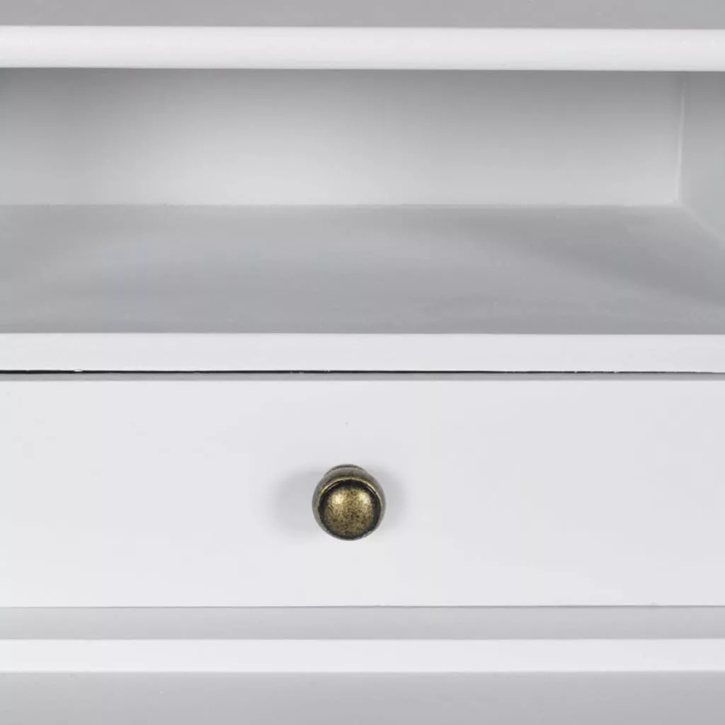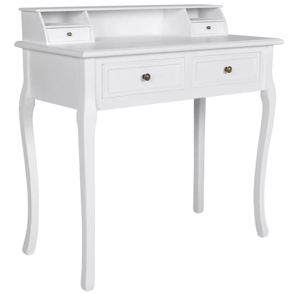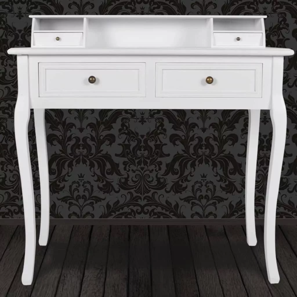 Ez a gyönyörű fésülködőasztal minden bizonnyal csinossá teszi hálószobáját, vagy öltöző helyiségét! Két kapcsolódó fiókkal rendelkezik az asztal két oldalán, amelyek az asztallaphoz kapcsolódva, megfelelő helyet kínálnak értéktárgyai számára. Kiegészítésképpen az asztal alsó részén további két teljes méretű fiókot talál, amely többlet-tárolóhelyet biztosít. A fiókok könnyen kivehetőek és tisztíthatóak. A finom fehér bevonat és a kecses, hajlított lábak csillogást és eleganciát biztosítanak. Ez az ajánlat egy darab fésülködőasztalt tartalmaz. Tekintse meg további termékeinket egy, az asztalhoz találó szék, tükör vagy bármilyen más kiegészítő kiválasztása érdekében. Kérjük, vegye figyelembe, hogy miután ez a bútor kézi készítésű, fából előállított és fehérre van festve, apróbb hibák lehetnek rajta.