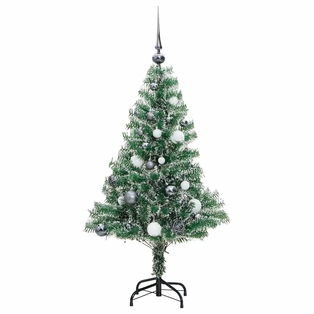 műkarácsonyfa 150 LED-del, gömbszettel és hópehellyel 150 cm
