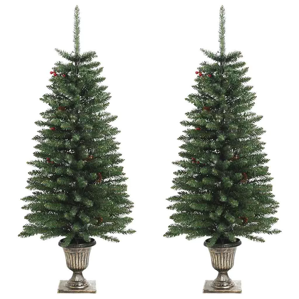 műkarácsonyfák 2 db koszorúval, füzérrel és LED-ekkel