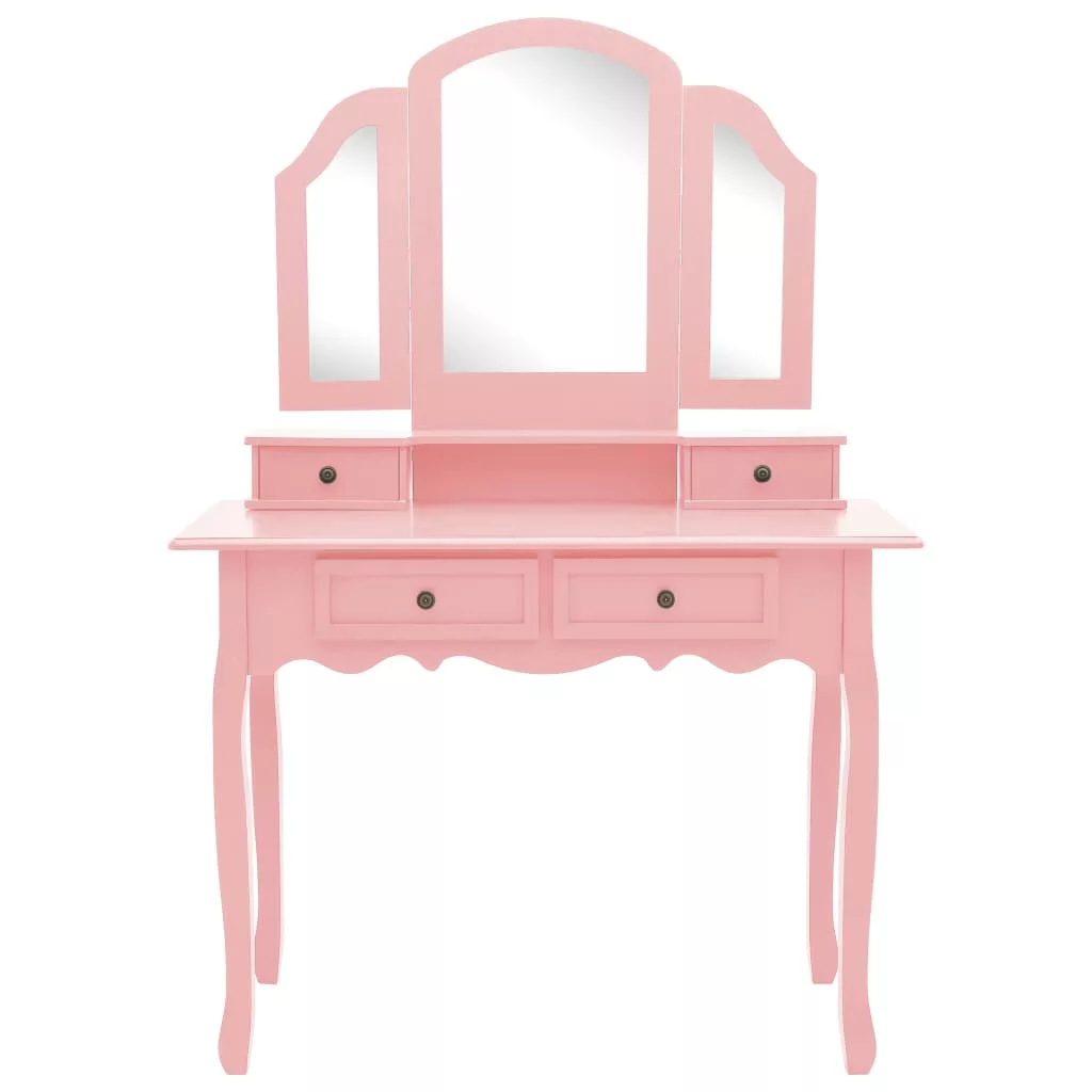 Bájos fésülködőasztalunk és ülőkénk kiváló minőségű császárfából készült. Viktoriánus stílusa és tiszta rózsaszín felülete eleganciát és szépséget visz budoárjába vagy öltözőjébe. A kifinomult kézművesmunka tovább növeli az asztal és az ülőke szépségét. Ez a sminkasztal egy 3 az 1-ben asztali tükörrel rendelkezik, amelyből a 2 oldalsó tükör összecsukható a tartós zsanérokkal. A kívánt szögbe is fordíthatja őket. Meglepő módon a tükörkeret és az asztal külön is használható. Ezenkívül a 4 elegáns fiók további helyet kínál dísztárgyainak, kozmetikumainak és egyéb fontos tárgyainak. Ez a pipereasztal- és székszett garantáltan szemet gyönyörködtető darab lesz, bárhová is kerül.