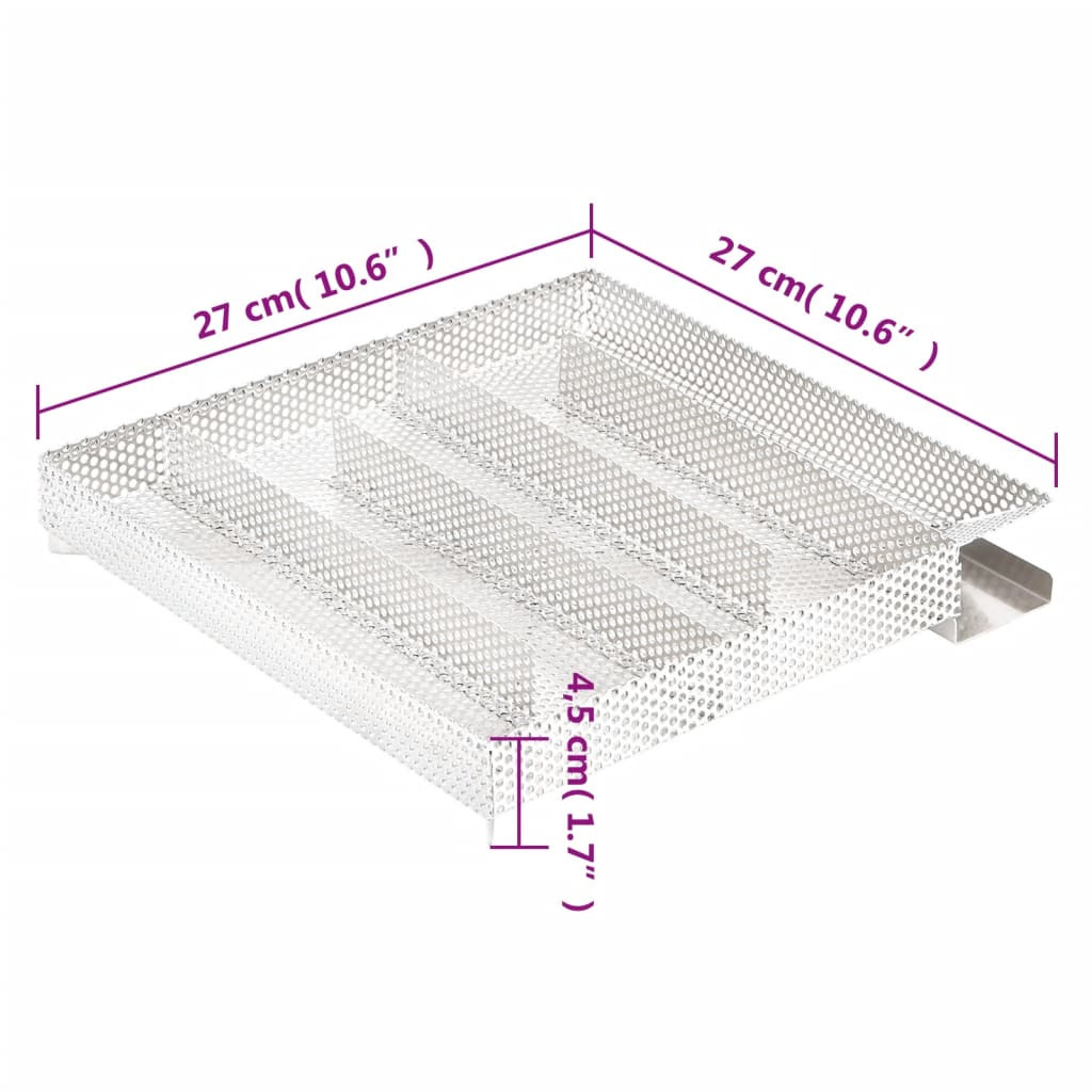 Adjon ételeinek finom füstös ízt a hidegfüst-generátorral! Ideális halak, húsok, szárnyasok, sajtok, zöldségek stb. füstölésére. Tartós anyag: Ez a hidegfüstölő kiváló minőségű 304-es rozsdamentes acélból készült, amely ellenáll a korróziónak és az oxidációnak. Emellett mosogatógépben is mosható.Masszív rácsszerkezet: A négyzet alakú kompakt háló lehetővé teszi a füstölőforgácsok egyenletes és lassú égését akár 16 órán keresztül. Az időtartam nagymértékben függ a füstölőfa természetétől. A legjobb eredmény elérésének érdekében 0,5-2,0 mm szemcseméretű forgács használata javasolt.Könnyen használható: Egyszerűen töltse fel fűrészporral, és gyújtsa meg egy teamécsessel, amíg a fűrészpornak el nem kezd megváltozni a színe. Vegye ki a teamécsest, és helyezze be a füstölőt.Széleskörű felhasználás: A hidegfüstölő-generátort különféle típusú füstölőkben használhatja, például füstölőszekrényben, asztali füstölőben, gázgrillező-betétben, grillsütőben, saját készítésű füstölőben, zárt grillsütőben stb.