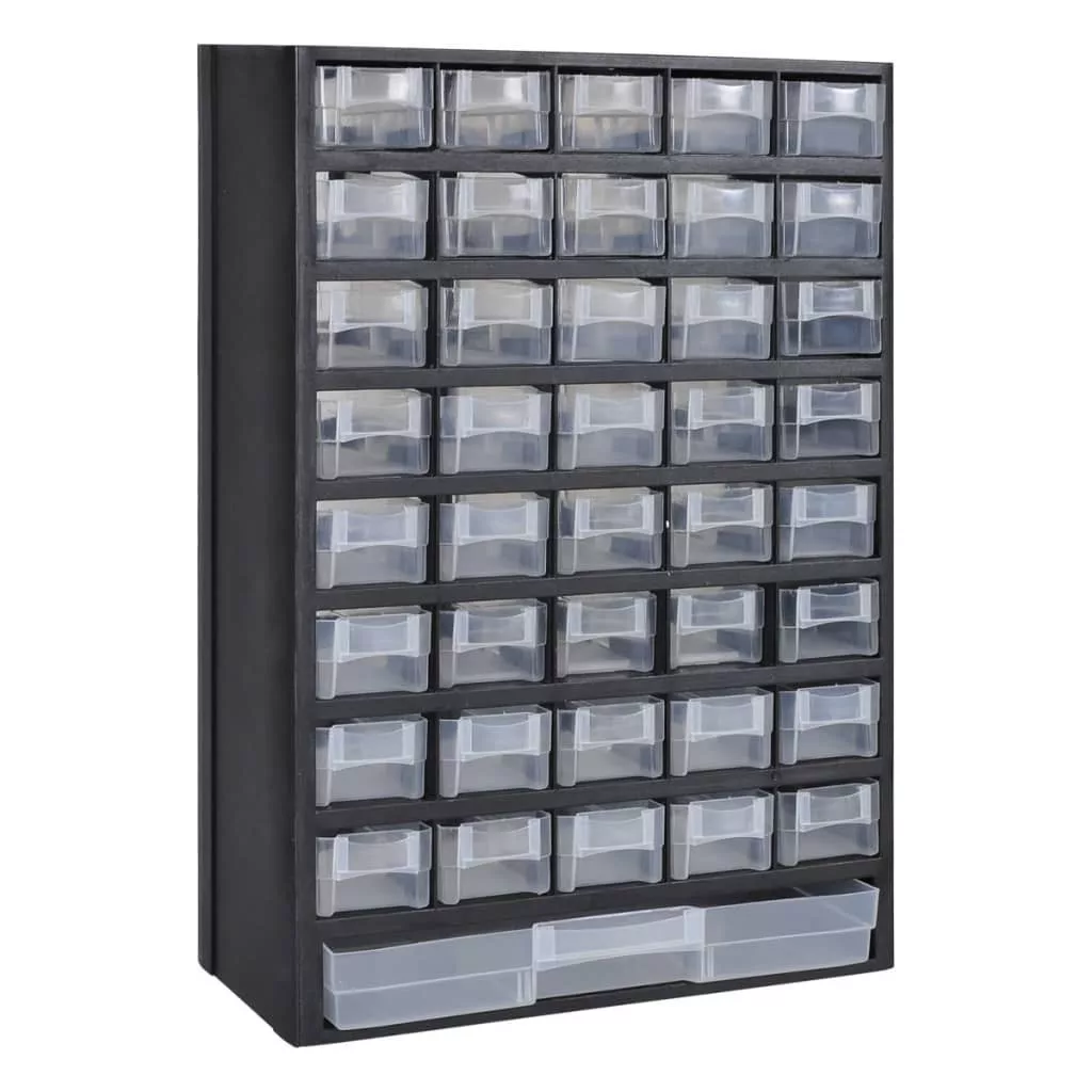 A 41-fiókos műanyag szerszámosláda egy nagyszerű módja annak, hogy megszervezze a munkaterületet a 40 kis és egy nagy fiókban. Ez tökéletes megoldás mindenféle apró dolgoknak mint például a kis méretű gép alkatrészek, kiegészítők, vagy akár barkács munkák. Fiókot lehet választani a tárolt dolgok méretétől függően ami be szeretne tenni. Tartós, átlátszó műanyag biztosítja a tárolást a fiókban, ami átlátszó. Van két kis lyuk a hátán hogy a falra vagy más felületre lehessen akasztani.