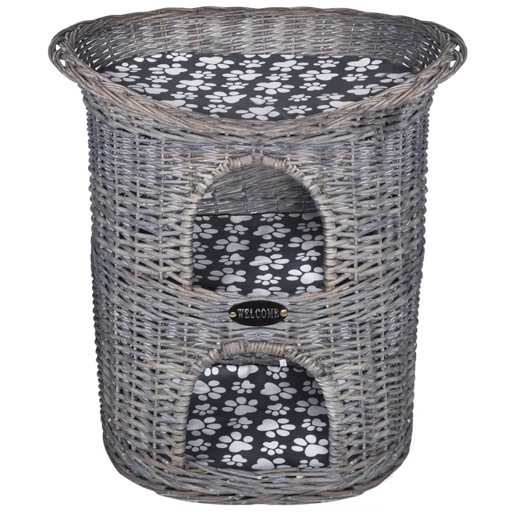 Ez a 2-szintes macskaház/torony kényelmes helyet biztosít kedvencének az alváshoz és pihenéshez, illetve klasszikus fűzfa dizájnjának köszönhetően bármilyen enteriőrbe illeszkedni fog. Remek ajándék lehet házi kedvencének vagy állatszerető barátjának! Ez az extravagáns és kidolgozott szőtt macskaágy, stílusos torony kialakítással, két szinttel rendelkezik. Az alsó szint egy bújós barlang, "ablakkal"; ahol a macskák elrejtőzhetnek és megfigyelhetik a teret. A felső emelet egy megfigyelő platform a pihenéshez és szunyókáláshoz. Mindkét emelet kényelmes párnával lett felszerelve. Ez a környezetbarát fűzfából készült kisállatház erős, ugyanakkor elég könnyű ahhoz, hogy magával vigye. Ez a 2-szintes kisállatház kint, a kertben vagy a teraszon is használható macskája, kiscicája, kutyája vagy kölyökkutyája által alváshoz, pihenéshez vagy játékhoz. A házi kedvencek élvezni fogják a napsütést, miközben a házikó tetején heverésznek!