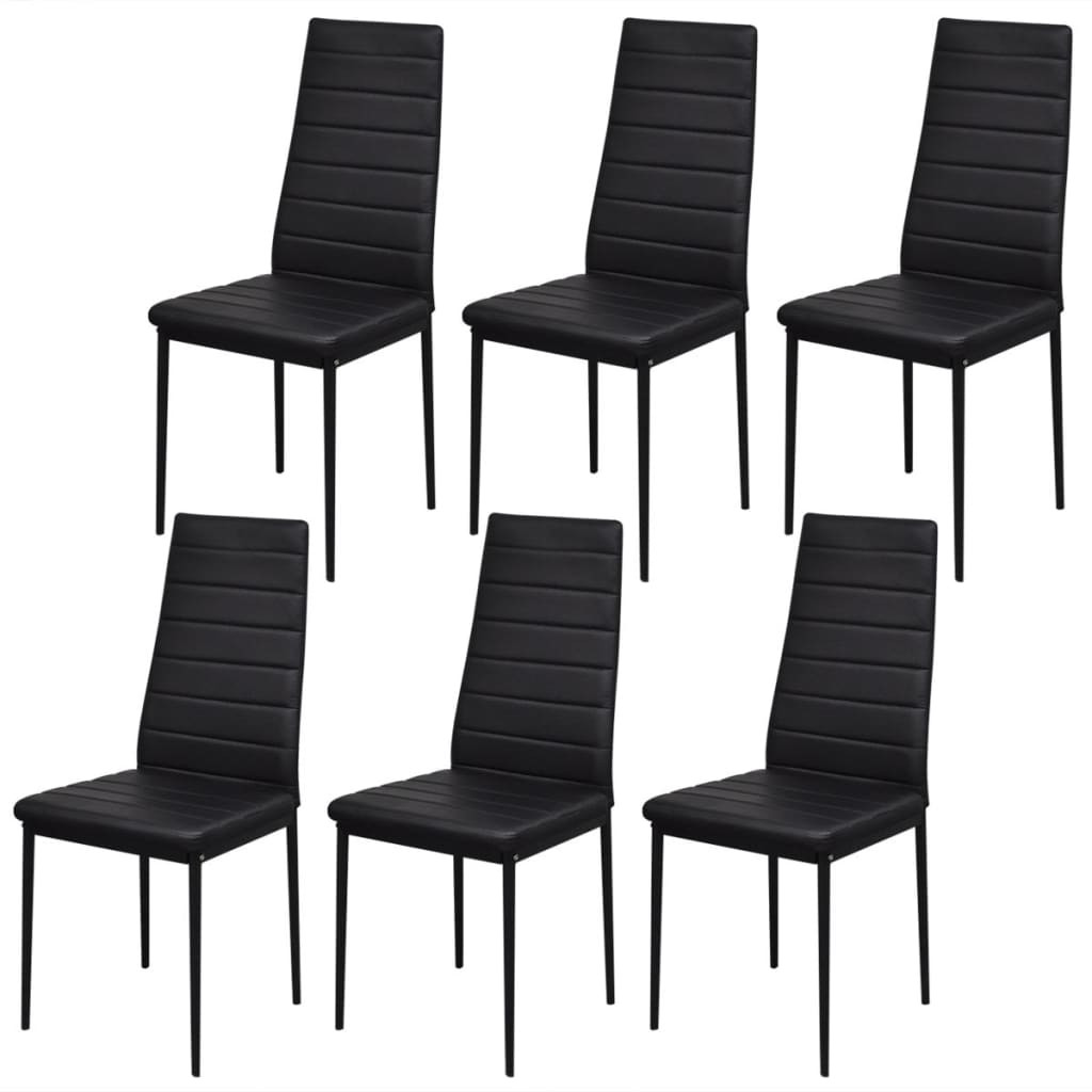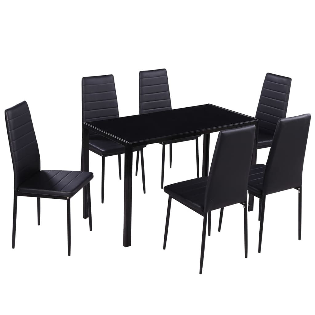 Ez a fekete 7 daarabos karcsú, modern tervezésű étkező szett, tökéletes azok számára, akik hozzá szeretnének adni egy kis stílust belső terükhöz. Az asztallap nagy szilárdságú edzett üvegből készült, amely könnyen tisztítható. Minden szék kiváló minőségű műbőrrel van kárpitozva. A rugalmas, párnázott ülés nagyon kényelmes. A szett 1 asztalt és 6 széket tartalmaz.