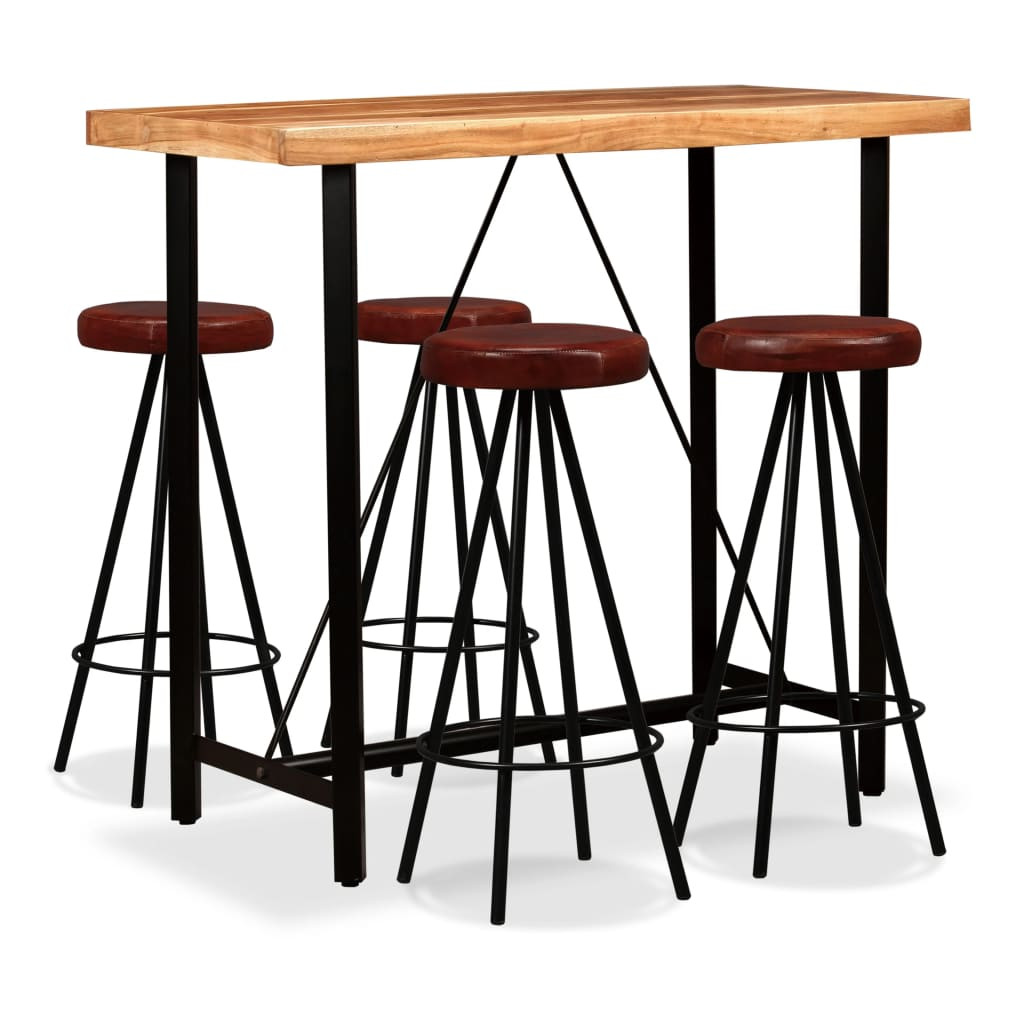 Ez a vagány bárszett ipari megjelenéssel bír, és megkapó kiegészítője lehet bármilyen otthonnak, bárnak vagy étteremnek. A bárasztal tömör akácfából készült, így strapabíró, stabil és könnyen tisztítható. Teljes egészében kézzel készült, a gyönyörű erezetnek köszönhetően minden bútordarab egyéni megjelenéssel bír, és kis mértékben eltér a többitől. Az erős acél lábak kiemelik az asztal ipari stílusát, és hozzájárulnak a stabilitásához. Fontos megjegyzés: A bútorok színe és erezete darabonként változhat, így minden bútor teljesen egyedi, és kis mértékben eltér a többitől. A kiszállítás véletlenszerűen történik. A bárszékek pihe-puha, valódi bőrből készültek, így rendkívül időtállók és kényelmesek. Az erős acél lábak kiemelik az asztal ipari stílusát, és hozzájárulnak stabilitásához. A szállítmány 1 db bárasztalt és 4 db bárszéket tartalmaz. Könnyen összeszerelhető. Maksimális 110 kg ülésenként. Legyen tudatában a nyílt tűz és más erős hőforrások kockázatának a termék környezetében.