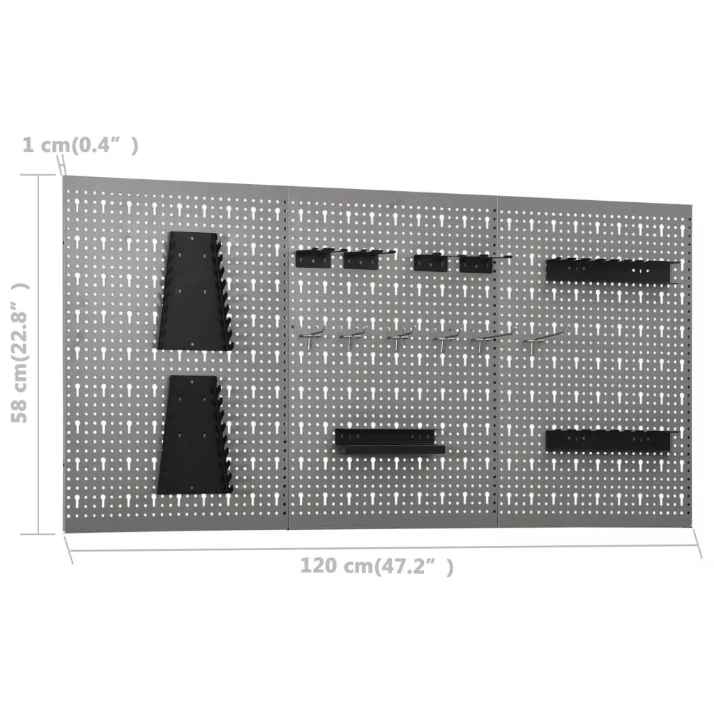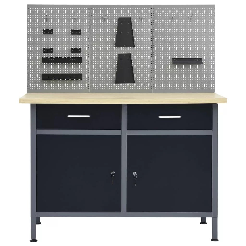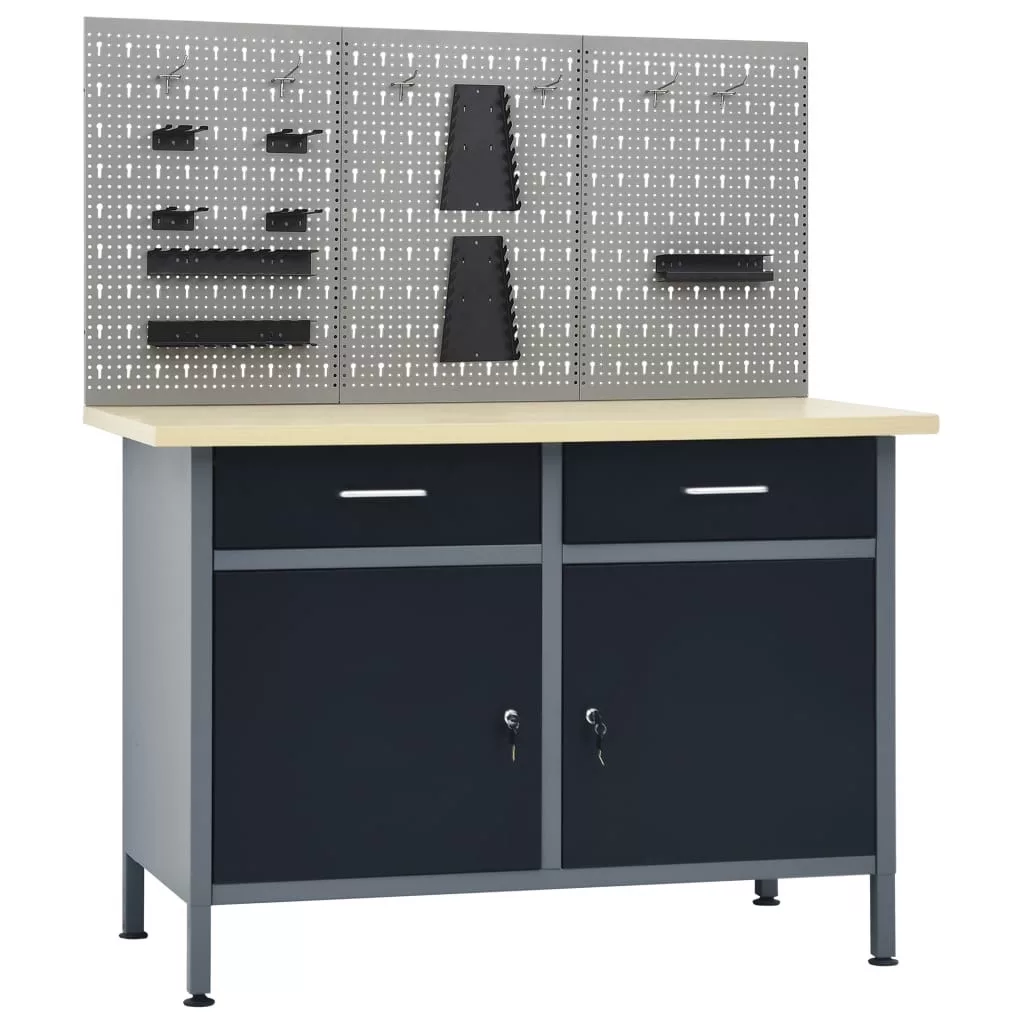 Ez az eszköz 1 nagy teherbírású munkapadból és 3 perforált fali panelből áll, így kiváló választás a különféle szerszámok rendszerezésére és tárolására. Ez a nagy teherbírású munkapad bőséges tárolóhelyével és 500 kg-s terhelhetőségével tűnik ki. A munkapad 2 fiókkal lett ellátva, melyben garantáltan rendezetten tárolhatja szerszámait, alkatrészeit és tartozékait, így például csavarokat, szögeket és ragasztószalagokat is. A fiókok a zökkenőmentes siklás érdekében golyóscsapágyas szerkezettel lettek felszerelve. 2 polc, valamint egy nagy rekesz is található rajta 2 zárható ajtóval ellátva, hogy könnyedén tárolhatóak legyenek benne fúrók, kábeldobok és köszörűk is. A lábak magassága állítható. A munkapad prémium acélból és forgácslapból készült, ezért rendkívül robusztus, strapabíró és könnyen tisztítható. Egyszerűen összeszerelhető. Ezek a tömör acélból készült szerszámtartó panelek elbírják a különböző szerszámok, például fúrók, fogók, csavarhúzók és villáskulcsok súlyát. A panelek a szerszámok egyszerű és biztonságos rögzítésének érdekében perforáltak. A 3 fali panel egymáshoz rögzíthető az extra szilárdság érdekében. 120 cm-es szélességű munkapad és műhelyszekrények ideális kiegészítője.