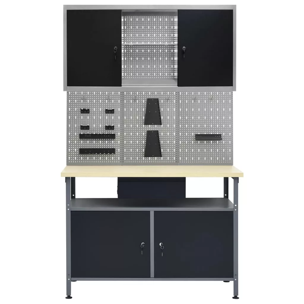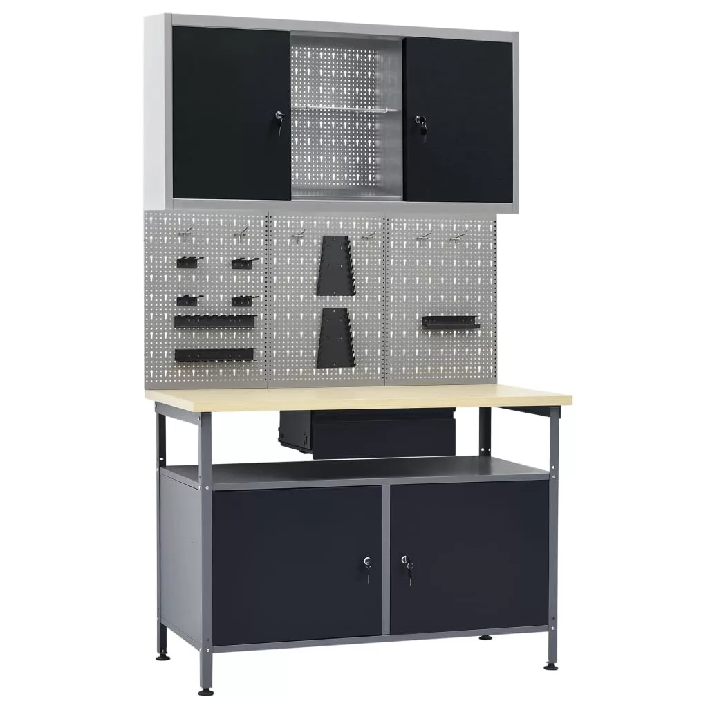 Ez a szett 1 munkapadból, 3 fali panelből és egy faliszekrényből áll, így praktikus tárolási megoldás műhelyében és garázsában. Ez a nagy teherbírású munkapad bőséges tárolóhelyével és 300 kg-s terhelhetőségével tűnik ki. Egy nyitott, fiókkal ellátott rekesszel lett ellátva, melyben garantáltan rendezetten tárolhatja szerszámait, alkatrészeit és tartozékait, így például csavarokat, szögeket és ragasztószalagokat is. 2 polccal és egy nagy, 2 zárható ajtóval ellátott rekesszel is fel lett szerelve, hogy könnyedén tárolhatóak legyenek benne a fúrók, kábeldobok és köszörűk is. A lábak magassága állítható. A munkapad prémium acélból és forgácslapból készült, ezért rendkívül robusztus, strapabíró és könnyen tisztítható. Egyszerűen összeszerelhető. Ezek a tömör acélból készült szerszámtartó panelek elbírják a különböző szerszámok, például fúrók, fogók, csavarhúzók és villáskulcsok súlyát. A panelek a szerszámok egyszerű és biztonságos rögzítésének érdekében perforáltak. A 3 fali panel egymáshoz rögzíthető az extra szilárdság érdekében. 120 cm-es szélességű munkapad és műhelyszekrények ideális kiegészítője. A szerszámtárolóban három állítható magasságú polc található, illetve egy perforált lemez lyukakkal, amelyekre különféle szerszámok – csavarkulcs, fogó, kalapács stb. – akaszthatók. Két zárható ajtaja (mindkét ajtóhoz 2 kulcs jár) extra biztonságot nyújt. Fémből készült, amelyen különlegesen erős karcálló bevonat van, ezáltal strapabíró és könnyen tisztítható. A terméket össze kell szerelni.