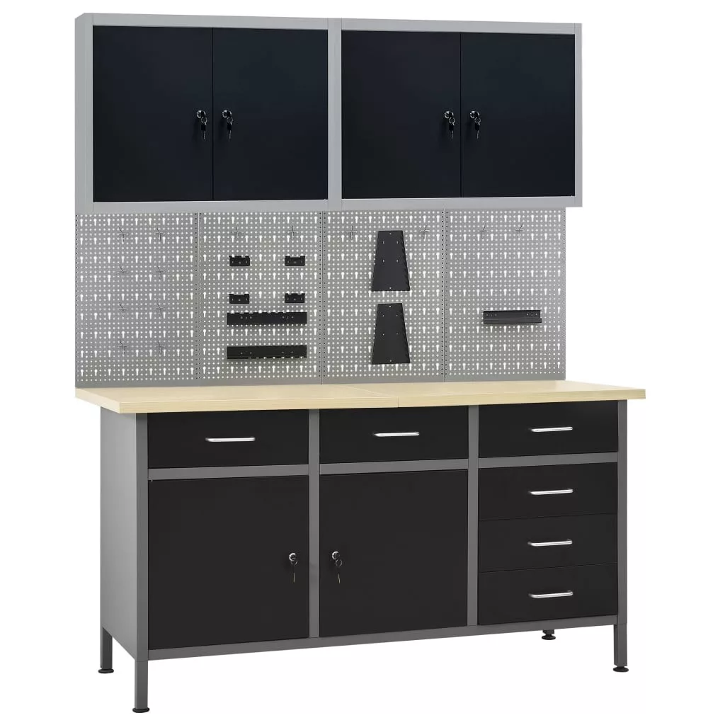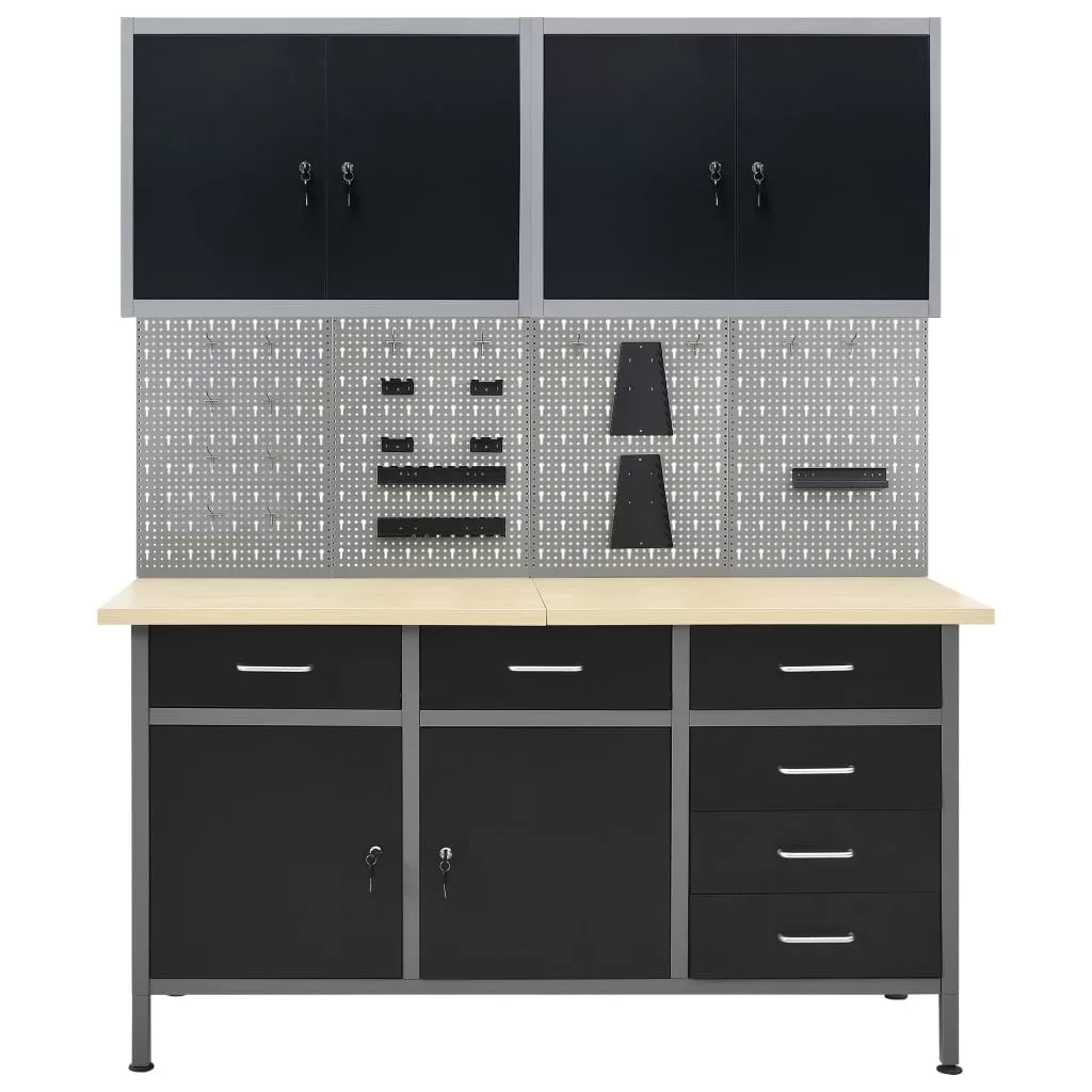 Ez az eszköz 1 nagy teherbírású munkapadból, 4 perforált fali panelből és 2 faliszekrényből áll, így kiváló választás a különféle szerszámok rendszerezésére és tárolására. Ez a nagy teherbírású munkapad bőséges tárolóhelyével és 500 kg-s terhelhetőségével tűnik ki. Ez a nagy és masszív asztallap stabil felületet biztosít minden javítási munkához. A munkapad 6 fiókkal lett ellátva, melyben garantáltan rendezetten tárolhatja szerszámait, alkatrészeit és tartozékait, így például csavarokat, szögeket és ragasztószalagokat is. Az összes fiók a zökkenőmentes siklás érdekében golyóscsapágyas szerkezettel lett felszerelve. 2 polc, valamint egy nagy rekesz is található rajta 2 zárható ajtóval ellátva, hogy könnyedén tárolhatóak legyenek benne fúrók, kábeldobok és köszörűk is. A lábak magassága állítható. A munkapad prémium acélból és forgácslapból készült, ezért rendkívül robusztus, strapabíró és könnyen tisztítható. Egyszerűen összeszerelhető. Ezek a tömör acélból készült szerszámtartó panelek elbírják a különböző szerszámok, például fúrók, fogók, csavarhúzók és villáskulcsok súlyát. A panelek a szerszámok egyszerű és biztonságos rögzítésének érdekében perforáltak. A 4 fali panel egymáshoz rögzíthető az extra szilárdság érdekében. 160 cm-es szélességű munkapad és műhelyszekrények ideális kiegészítője. A szerszámtárolóban két állítható magasságú polc található, illetve egy perforált lemez lyukakkal, amelyekre különféle szerszámok – csavarkulcs, fogó, kalapács stb. – akaszthatók. Két zárható ajtaja (mindkét ajtóhoz 2 kulcs jár) extra biztonságot nyújt. Fémből készült, amelyen különlegesen erős karcálló bevonat van, ezáltal strapabíró és könnyen tisztítható. A terméket össze kell szerelni.