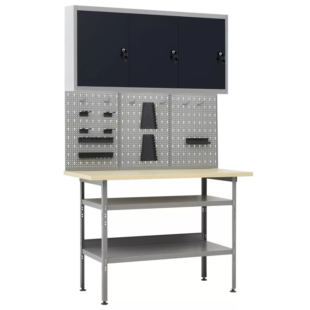 Ez a szett 1 munkapadból, 3 fali panelből és egy faliszekrényből áll, így praktikus tárolási megoldás műhelyében és garázsában. A nagy teherbírású munkapad bőséges tárolóhellyel és 300 kg-os teherbírással rendelkezik. A munkapad 2 nagy polcán könnyen tárolhat fúrókat, kábeldobokat, köszörűket és egyéb szerszámokat. Emellett a lábak magassága állítható. Ez a munkaállomás prémium acélból és forgácslapból készült, így különösen erős, tartós és könnyen tisztítható. Könnyű összeszerelni. Ezek a tömör acélból készült szerszámtartó panelek elbírják a különböző szerszámok, például fúrók, fogók, csavarhúzók és villáskulcsok súlyát. A panelek a szerszámok egyszerű és biztonságos rögzítésének érdekében perforáltak. A 3 fali panel egymáshoz rögzíthető az extra szilárdság érdekében. 120 cm-es szélességű munkapad és műhelyszekrények ideális kiegészítője. A szerszámtárolóban három állítható magasságú polc van, illetve egy perforált lemez lyukakkal, amelyre különféle szerszámok – csavarkulcs, fogó, kalapács stb. – akaszthatók. Három zárható ajtaja (mindkét ajtóhoz 2 kulcs jár) extra biztonságot nyújt. Fémből készült, amelyen különlegesen erős karcálló bevonat van, ezáltal strapabíró és könnyen tisztítható. A terméket össze kell szerelni.