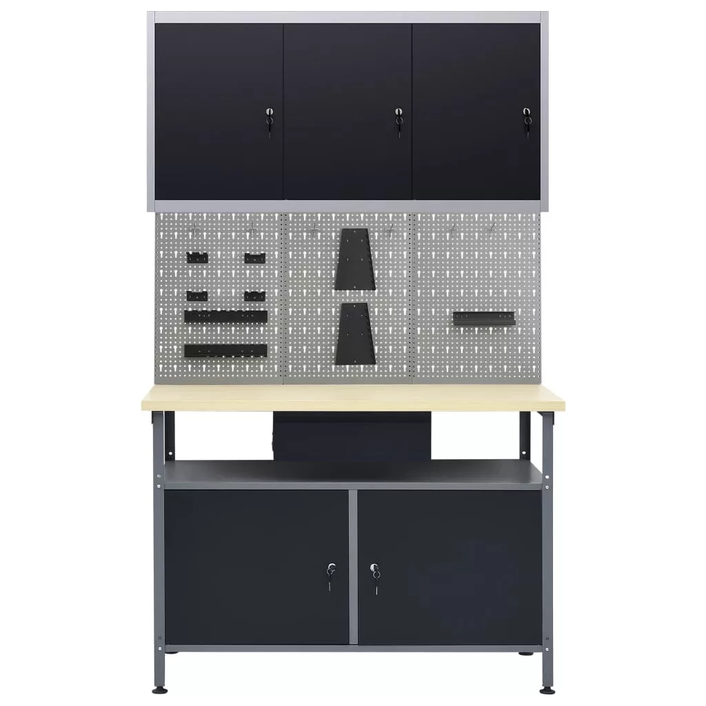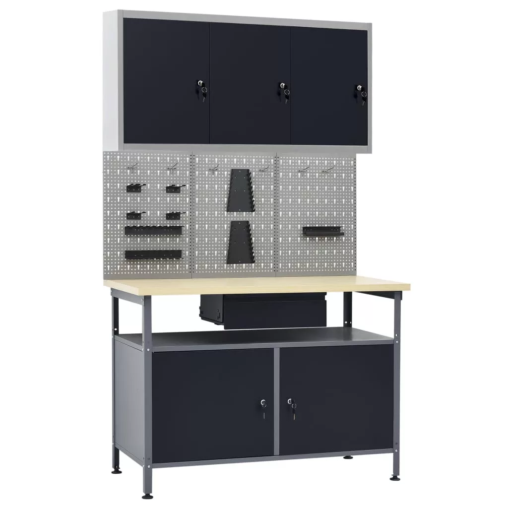 Ez a szett 1 munkapadból, 3 fali panelből és egy faliszekrényből áll, így praktikus tárolási megoldás műhelyében és garázsában. Ez a nagy teherbírású munkapad bőséges tárolóhelyével és 300 kg-s terhelhetőségével tűnik ki. Egy nyitott, fiókkal ellátott rekesszel lett ellátva, melyben garantáltan rendezetten tárolhatja szerszámait, alkatrészeit és tartozékait, így például csavarokat, szögeket és ragasztószalagokat is. 2 polccal és egy nagy, 2 zárható ajtóval ellátott rekesszel is fel lett szerelve, hogy könnyedén tárolhatóak legyenek benne a fúrók, kábeldobok és köszörűk is. A lábak magassága állítható. A munkapad prémium acélból és forgácslapból készült, ezért rendkívül robusztus, strapabíró és könnyen tisztítható. Egyszerűen összeszerelhető. Ezek a tömör acélból készült szerszámtartó panelek elbírják a különböző szerszámok, például fúrók, fogók, csavarhúzók és villáskulcsok súlyát. A panelek a szerszámok egyszerű és biztonságos rögzítésének érdekében perforáltak. A 3 fali panel egymáshoz rögzíthető az extra szilárdság érdekében. 120 cm-es szélességű munkapad és műhelyszekrények ideális kiegészítője. A szerszámtárolóban három állítható magasságú polc van, illetve egy perforált lemez lyukakkal, amelyre különféle szerszámok – csavarkulcs, fogó, kalapács stb. – akaszthatók. Három zárható ajtaja (mindkét ajtóhoz 2 kulcs jár) extra biztonságot nyújt. Fémből készült, amelyen különlegesen erős karcálló bevonat van, ezáltal strapabíró és könnyen tisztítható. A terméket össze kell szerelni.