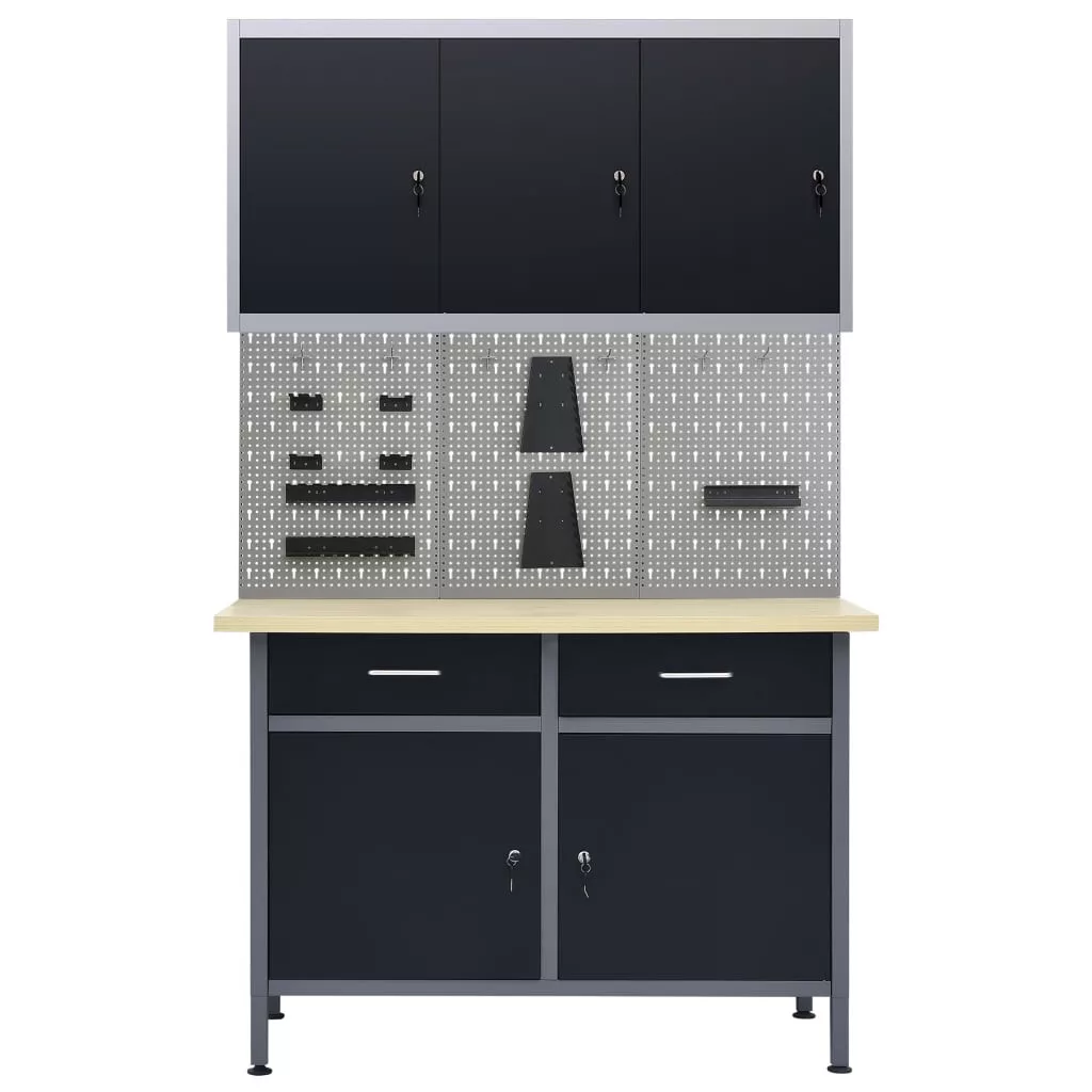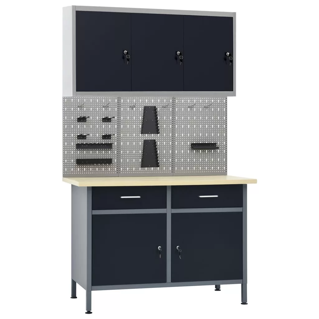 Ez a szett 1 munkapadból, 3 fali panelből és egy faliszekrényből áll, így praktikus tárolási megoldás műhelyében és garázsában. Ez a nagy teherbírású munkapad bőséges tárolóhelyével és 500 kg-s terhelhetőségével tűnik ki. A munkapad 2 fiókkal lett ellátva, melyben garantáltan rendezetten tárolhatja szerszámait, alkatrészeit és tartozékait, így például csavarokat, szögeket és ragasztószalagokat is. A fiókok a zökkenőmentes siklás érdekében golyóscsapágyas szerkezettel lettek felszerelve. 2 polc, valamint egy nagy rekesz is található rajta 2 zárható ajtóval ellátva, hogy könnyedén tárolhatóak legyenek benne fúrók, kábeldobok és köszörűk is. A lábak magassága állítható. A munkapad prémium acélból és forgácslapból készült, ezért rendkívül robusztus, strapabíró és könnyen tisztítható. Egyszerűen összeszerelhető. Ezek a tömör acélból készült szerszámtartó panelek elbírják a különböző szerszámok, például fúrók, fogók, csavarhúzók és villáskulcsok súlyát. A panelek a szerszámok egyszerű és biztonságos rögzítésének érdekében perforáltak. A 3 fali panel egymáshoz rögzíthető az extra szilárdság érdekében. 120 cm-es szélességű munkapad és műhelyszekrények ideális kiegészítője. A szerszámtárolóban három állítható magasságú polc van, illetve egy perforált lemez lyukakkal, amelyre különféle szerszámok – csavarkulcs, fogó, kalapács stb. – akaszthatók. Három zárható ajtaja (mindkét ajtóhoz 2 kulcs jár) extra biztonságot nyújt. Fémből készült, amelyen különlegesen erős karcálló bevonat van, ezáltal strapabíró és könnyen tisztítható. A terméket össze kell szerelni.