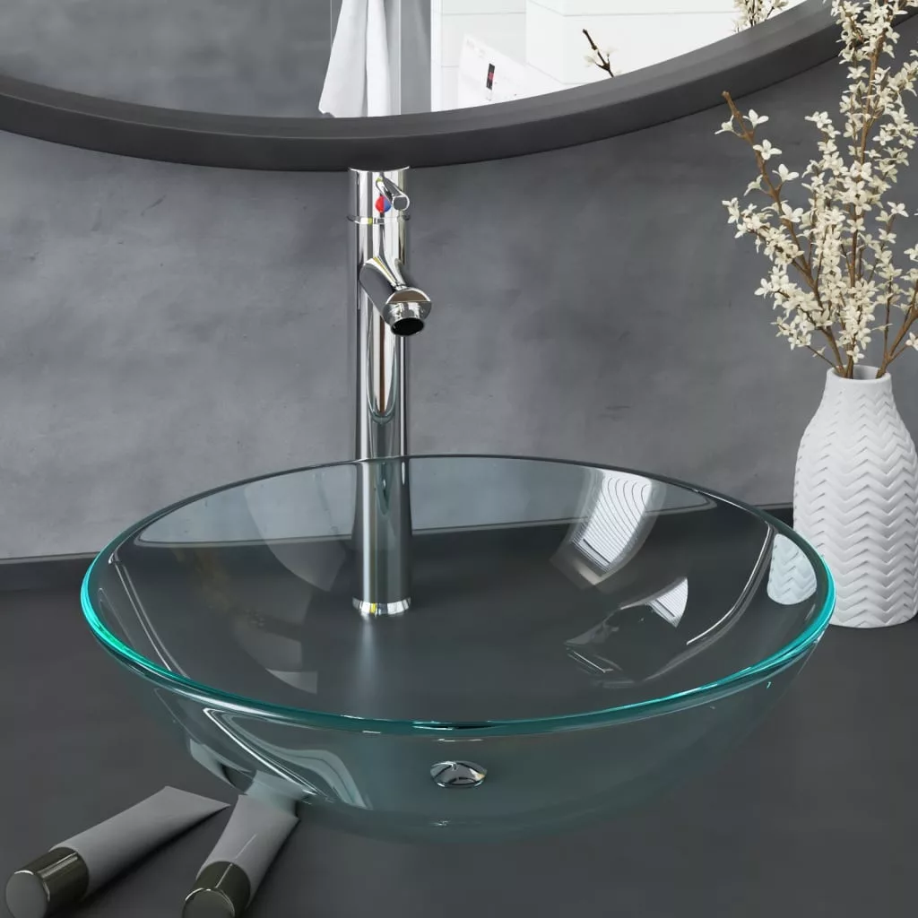 edzett üveg mosdókagyló csapteleppel és leeresztőszeleppel