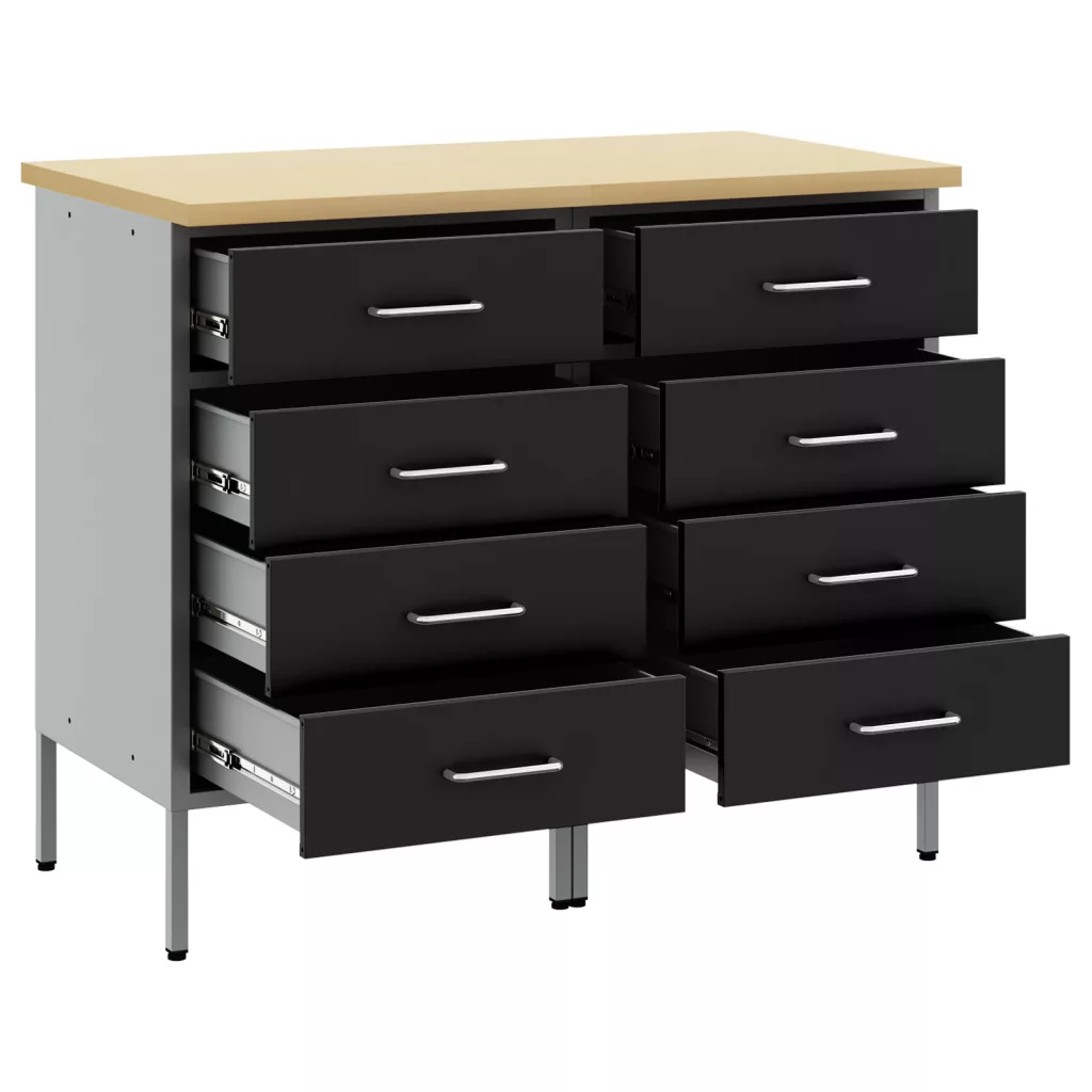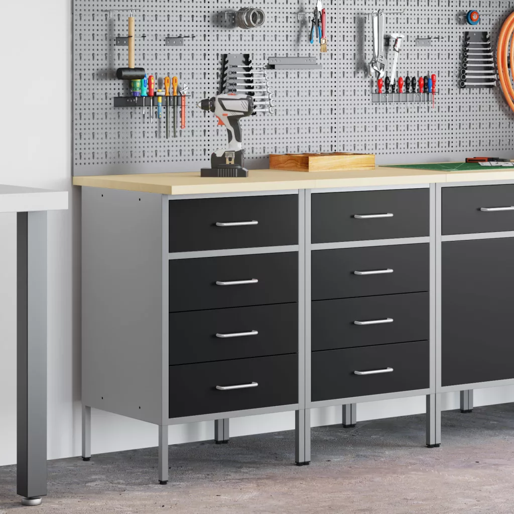 Ez az ipari acél munkaszekrény szuper tárolást kínál a garázsodban és műhelyedben, egy stílusos csavarral. Robosztus acél váz és mérnöki fa asztallap biztosítja a tartósságot és modern megjelenést a munkaterületen. Tágas tárolás: Négy fiók elég helyet ad a szerszámoknak és kellékeknek, mindig elérhető és rendezett formában tartva őket. Masszív szerkezet: Porbevonatos acélból készült, megerősített sarkokkal, így a szekrény sokáig bírja a strapát minden tárolási élményedhez. Magasság állítható: Az állítható lábak révén a munkaszekrény könnyen beállítható bármilyen felületen a stabilitás érdekében. Golyóscsapágyas fiókok: Simán mozgó golyóscsapágyas csúszkáknak köszönhetően egyszerű a fiókok nyitása, gyors hozzáférést biztosítva a fontos szerszámaidhoz a projektek során. Elegáns esztétika: A matt felület fás mintázatokkal nemcsak funkcionálissá, hanem vizuálisan vonzóvá is teszi ezt a szekrényt, remekül beleillik bármilyen ipari vagy modern dekorációba.