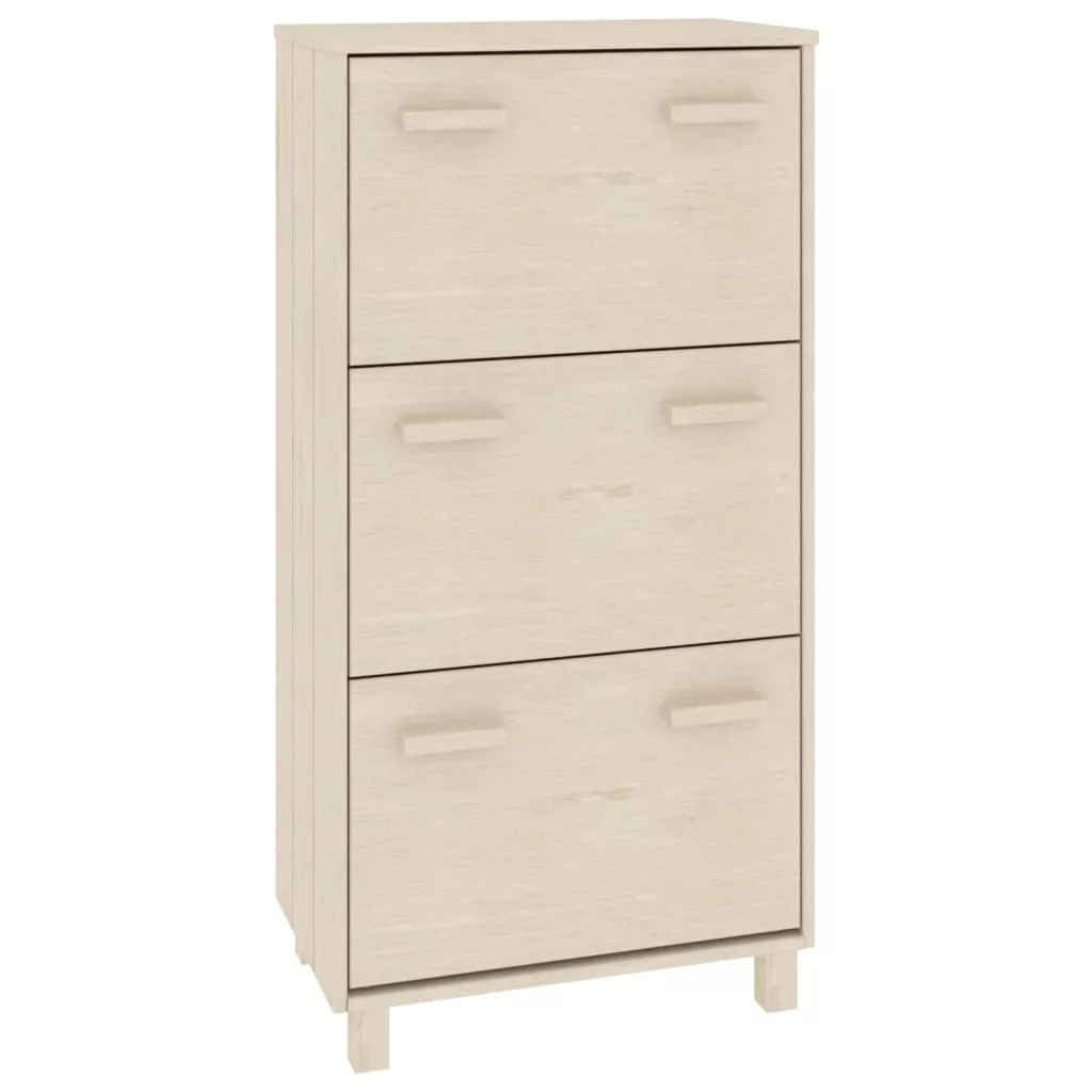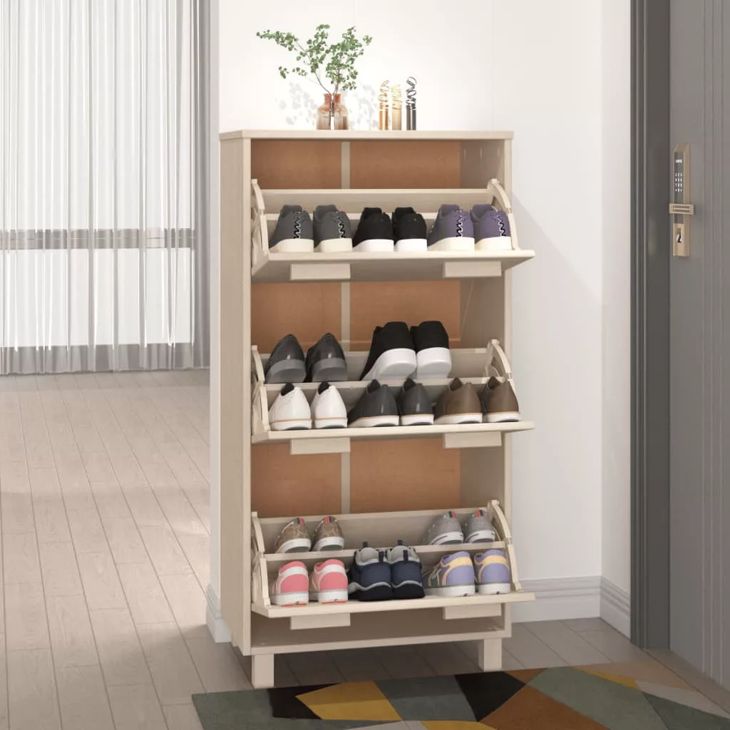 Ez a fa cipősszekrény otthona dekoratív és praktikus kiegészítője lesz. Ez a cipőállvány tömör fenyőfából készült, így stabil és masszív. Három lenyitható fiókkal rendelkezik, így bőséges helyet kínál cipői tárolására és portól való megóvására. Ezzel a praktikus cipőtárolóval nem fog többé azon bosszankodni, hogy a lábbelik szanaszét hevernek padlót.
