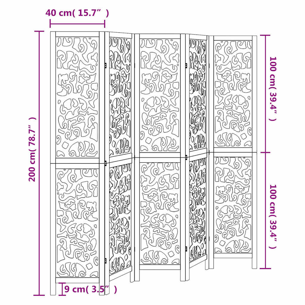 Vigyen eleganciát és szemet gyönyörködtető dekorációt a terébe ezzel a bájos térelválasztóval. Tartós és könnyen tisztítható: A térelválasztó szerelt fából készült, így könnyen tisztítható és tartós.Stabil váz: A tömör császárfa váz szilárdságot és stabilitást biztosít. A tömör császárfa egy gyönyörű természetes anyag. A császárfa rendkívül ellenálló a rovarokkal és a korhadással szemben.Rugalmas és könnyen összecsukható: Minden térelválasztó 3 fémpánttal, a felső és alsó panelek pedig rejtett, 2 az 1-ben zsanérokkal lettek összekötve. Így a térelválasztó panel a helytakarékosság érdekében könnyen összecsukható bizonyos mértékig, az Ön igényei szerint.Többcélú: A térelválasztó kiválóan alkalmas arra, hogy privát teret alakítson ki hálószobájában, nappalijában, irodájában, és más belső terekben. Az ablak elé is elhelyezheti, hogy megelőzze az intenzív napfény beáramlását.Mutatós megjelenés: Ez a kifinomult megjelenésű, összecsukható térelválasztó karakteres megjelenést és díszítést kölcsönöz a térnek. Figyelem:Csak beltéri használatra.