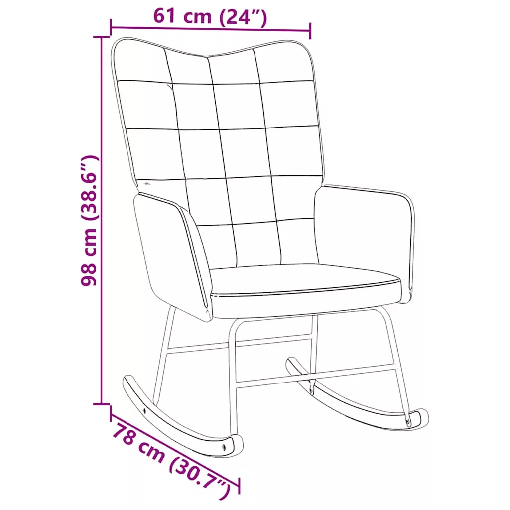 Olyan széket keres, amelyben egy fárasztó nap után teljesen kipihenheti magát? Ez a kényelmes hintaszék tökéletes választás! Puha és kényelmes anyag: A bársony szövet puha és sima felülettel rendelkezik, amely kellemes tapintású, meleg, és maximális kényelmet biztosít.Robusztus és stabil keret: A karosszék rétegelt lemez és fém váza biztosítja a szilárdságot és a stabilitást.Kényelmes ülésélmény: A fotel vastagon párnázott üléssel és háttámlával, valamint karfákkal rendelkezik a nagy kényelem érdekében.Fából készült lábak: A falábak kiváló stabilitást biztosítanak, miközben természetes és kellemes megjelenést kölcsönöznek a széknek. A hosszú hintasínek kialakításával a fotel nem fog könnyen felborulni.Széles körű alkalmazások: Ez a társalgószék sokoldalú és stílusos kiegészítője bármely otthoni vagy irodai szabadidős területnek.