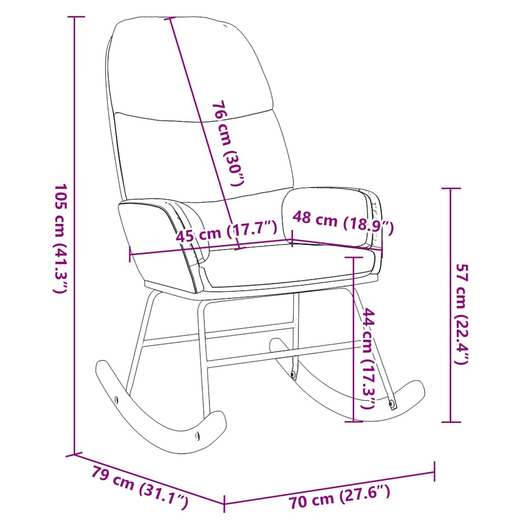 Olyan széket keresel, ahol lazíthatsz egy fárasztó nap után? Ez a kényelmes hintaszék kiváló választás! Puha és kényelmes anyag: A bársony szövet puha és sima felülettel rendelkezik, amely kellemes tapintású, meleg, és maximális kényelmet biztosít.Kényelmes ülésélmény: A karosszék puha kárpitozása tökéletes kényelmet és támaszt nyújt, kellemes ülési élményt biztosítva.Sokoldalú használat: Ez a társalgószék sokoldalú és stílusos kiegészítője bármely otthoni vagy irodai szabadidős területnek. Akár a nappali kanapéja közelében helyezi el, akár egy hangulatos sarkot alakít ki hálószobájában vagy dolgozószobájában, feldobja életterének esztétikáját.Sima és gyengéd ringató mozgás: A hintaszék sima, gyengéd hintamozgást biztosít, amely nyugtató hatást kelt, és segít a relaxálásban.