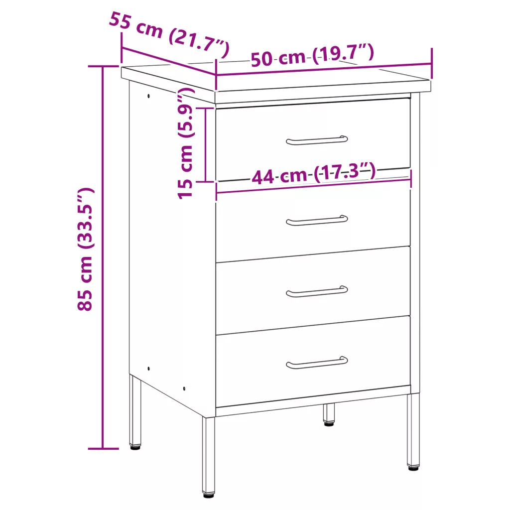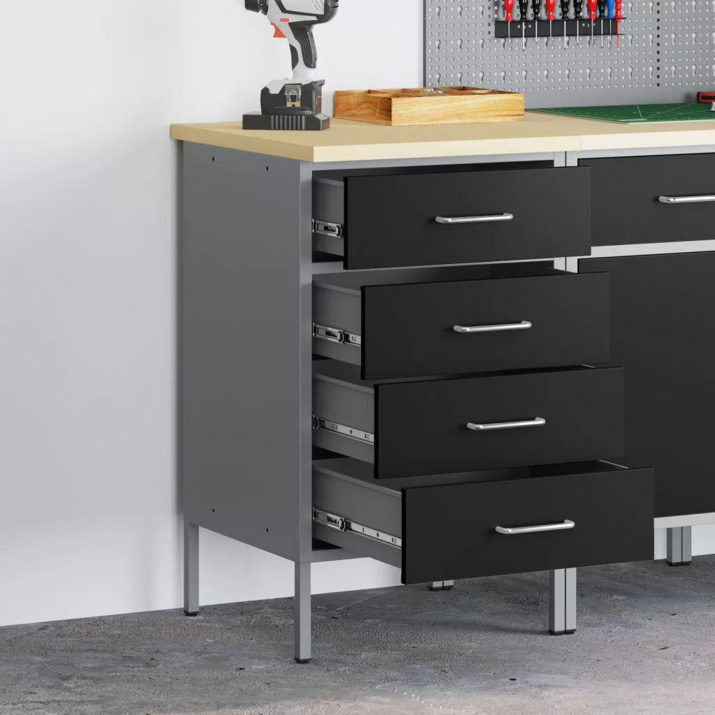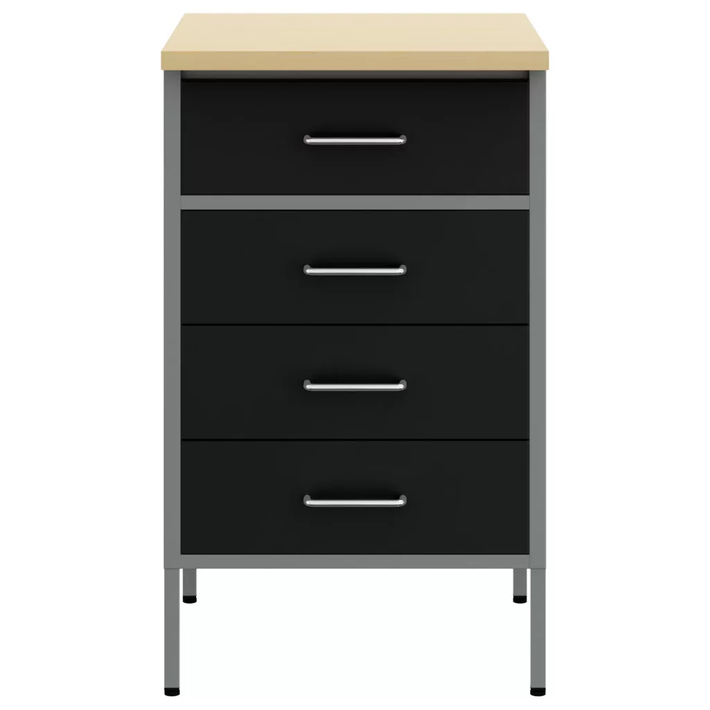 Ez az Ipari Munkaszekrény pontosan az, amire szükséged van bármilyen műhelyhez vagy garázshoz. Rengeteg tárolóhelyet biztosít stílusrombolás nélkül. A letisztult fekete és szürke dizájn nemcsak szépen mutat, hanem a szerszámaidat könnyen elérhetővé és rendezetté teszi. Ez a munkaszekrény négy hagyományos fiókkal rendelkezik, mindegyik a szerszámok és kiegészítők tárolására alkalmas, így mindig minden kéznél lesz. A tartós acélból és természetes fából készült, megbízható választás a komoly barkácsolóknak. A fiókok elegáns D-zsanéros fogantyúi egy kis eleganciát adnak, és könnyen hozzáférhetsz velük, még ha a kezeid tele is vannak. Kompakt méretek, 55cm széles, 50cm mély és 85cm magas, kis műhelyekhez is szépen illeszkedik, miközben a funkcionalitása megmarad. Az összeszerelés gyerekjáték - csak grab a csavarhúzót, így mindenki számára könnyen elérhető, aki szeretné felturbózni a munkaterületét.