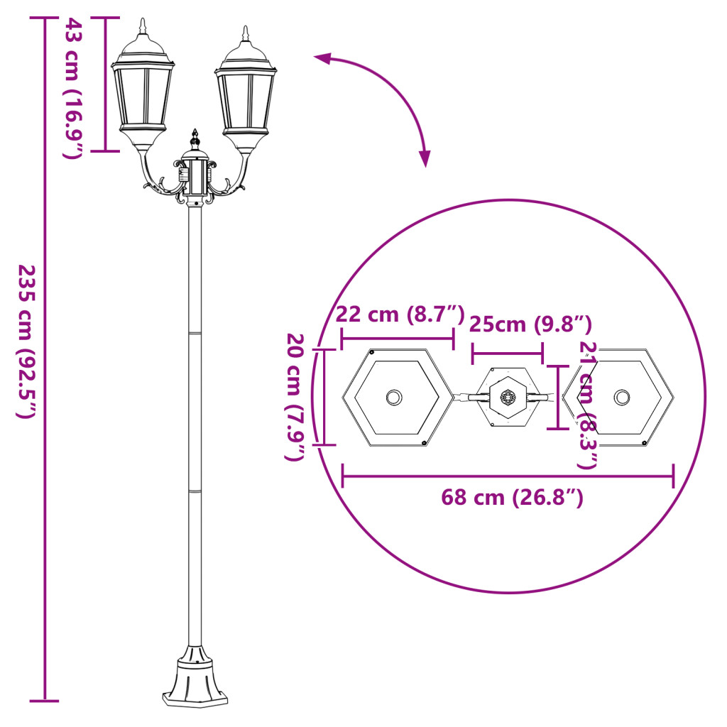 Ez a bronz ösvénylámpaoszlop stílust és modern funkciót hoz bármilyen kültéri térbe. Kitűnően megvilágítja a kerteket, udvarokat és teraszokat, míg a fém bronz bevonat és a tiszta üveg barátságos hangulatot teremt. A klasszikus dizájnja emeli a kültéri terek hangulatát. A lámpaoszlop masszív fém felépítése stabilitást ad, így megbízható kültéri világítást biztosít. Energiahatékony fénye segít csökkenteni a rezsit, miközben szépen megvilágítja az utakat. A klasszikus stílusa jól passzol a különböző dekorációkhoz, bármilyen kültéri térhez ideális. Csak kültéri használatra készült, vízálló, így akár viharos időben is megőrzi a fényét. Felhasználóbarát összeszereléshez csak egy csavarhúzó kell, így könnyen telepíthető bárki által. Ne csatlakoztassa ezt a terméket más tápegységhez vagy adapterhez, mint ami a használati útmutatóban, a névtáblán szerepel, vagy amit kifejezetten a VidaXL ajánlott. NE hagyja, hogy a gyermekek játszanak a termékkel. EZ NEM JÁTÉK. Ez a termék 8 évesnél idősebb gyermekek és csökkent fizikai, érzékszervi vagy mentális képességekkel rendelkező személyek, illetve tapasztalattal és tudással nem rendelkező személyek számára is használható, de csak megfelelő felügyelet mellett, hogy elkerüljük a súlyos sérüléseket és baleseteket. Ne hagyja, hogy a gyermekek tisztítsák vagy végezzenek karbantartást felügyelet nélkül. Az elektromosság veszélyes. A sérülés és a helytelen használat vagy módosítás, például az egyes alkatrészek cseréje a termék és a hálózati vezetékek sérüléséhez vezethet, ami áramütést és súlyos sérüléseket okozhat a felhasználónak. NE használja ezt a terméket robbanóanyagok, például gyúlékony folyadékok, gázok és porok jelenlétében, vagy extrém hőmérsékletek mellett, 50 Celsius fok felett. Ügyeljen arra, hogy a telepítés és karbantartás közben a tápfeszültség ki legyen kapcsolva. NE nyissa ki, és ne helyezzen semmit az elektromos csatlakozókba vagy az eszközbe. Ez súlyos veszélyt és akár áramütést is okozhat. Ne módosítja a termék meglévő elektromos áramkörét. A lámpa nem alkalmas soros összekapcsolásra. Cserélje ki minden megrepedt védőburkolatot. Ez a lámpa kültéri elektromos termék, és csak képzett villanyszerelő telepítheti és szerelheti össze. Kérem, használjon H05RN-f 3G1mm² tápkábeleket vagy nagyobb keresztmetszetű kábeleket. Kérem, használjon kéttárcsás kapcsolót.