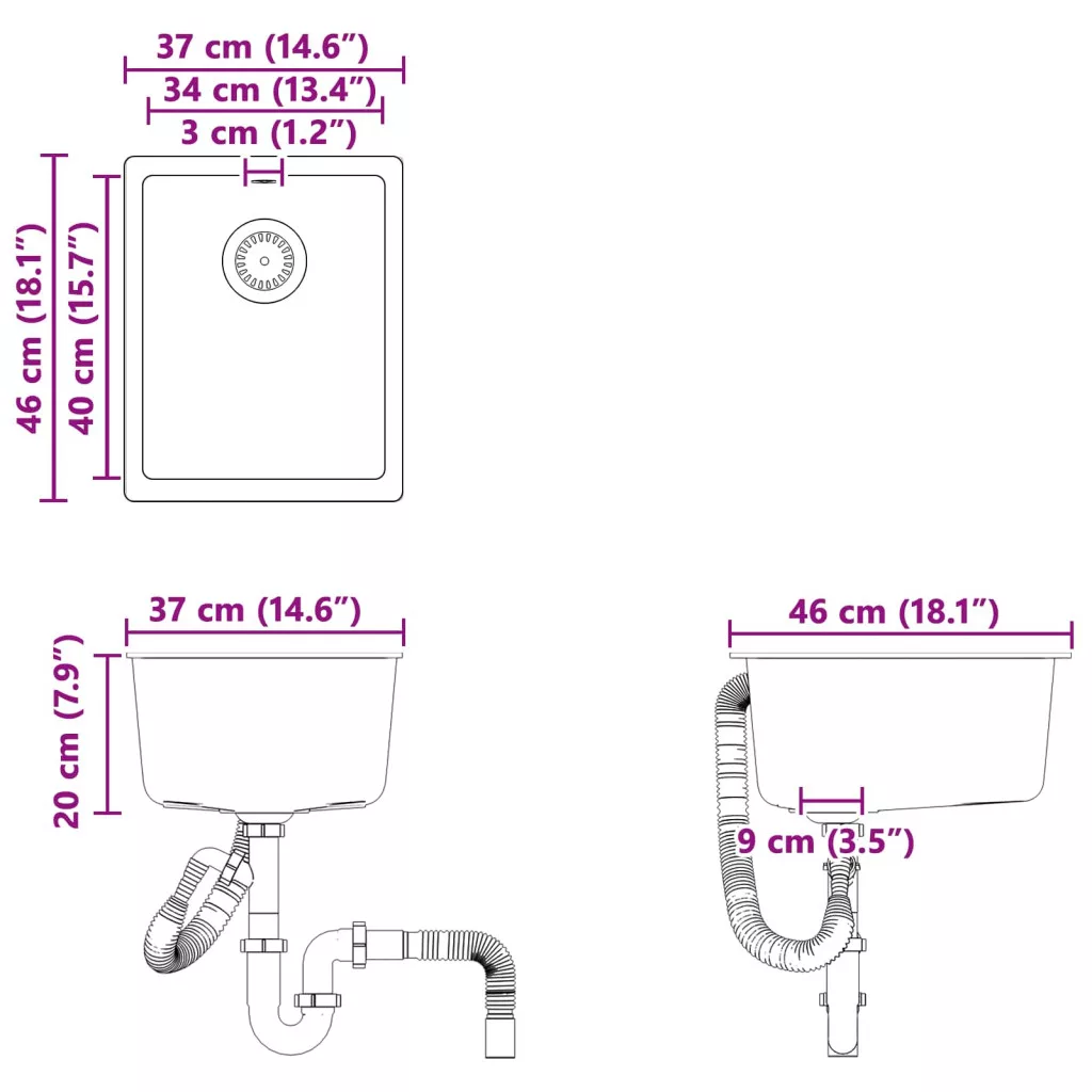 Mosogató Fekete 370 x 460 mm 80% Kvarc és 20% Gyanta