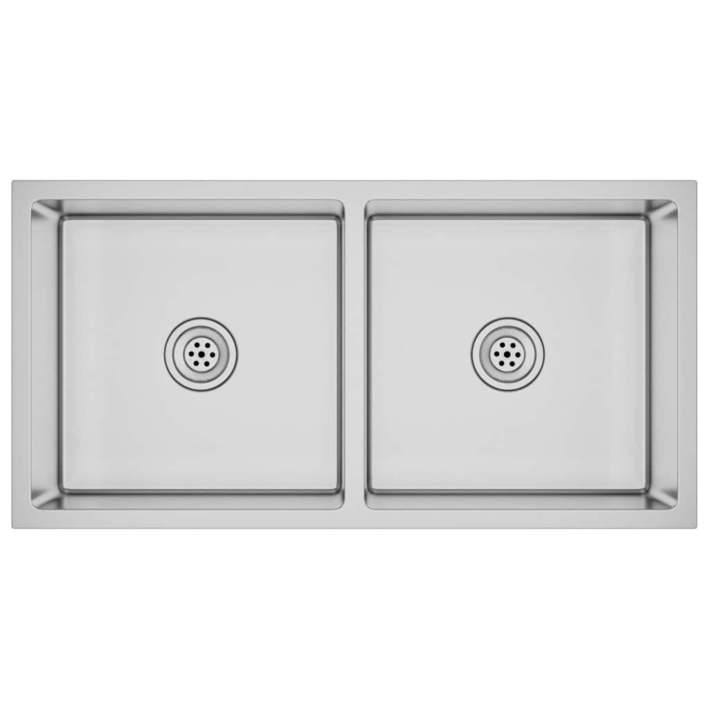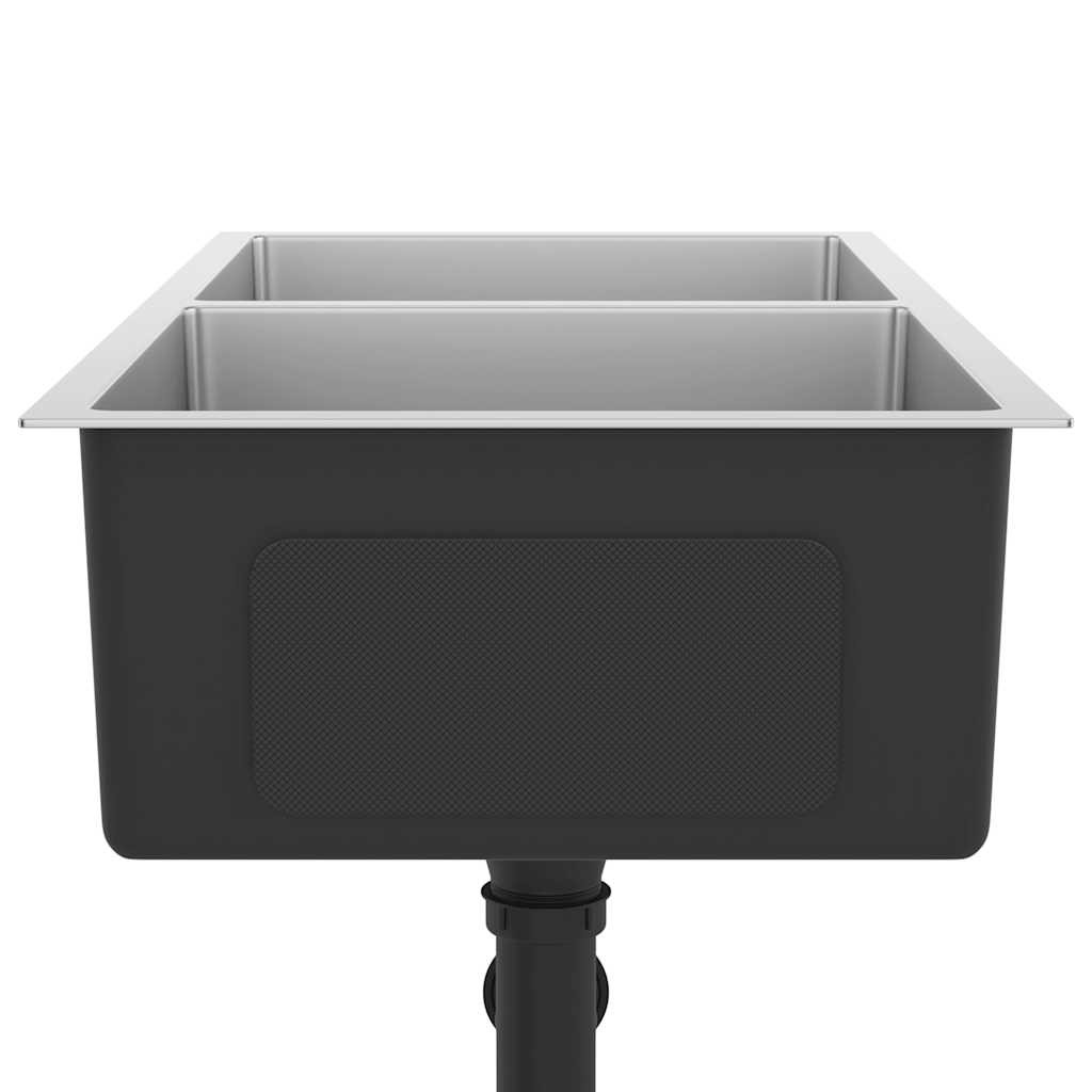 Élvezze letisztult, modern kialakítású mosogatónk minden előnyét! A selymesen sima szaténbevonattal ellátott két tálca stílust és kifinomultságot sugároz, így bármilyen konyhába illeni fog. Ez a mosogató a funkcionalitást és a dizájnt ötvözi. Kiváló minőségű rozsdamentes acélból készült kézzel, mely párásodásgátló festékkel lett felülkezelve, így penészálló, ólommentes és korrózióálló. A zajcsökkentő alátéteknek köszönhetően hangszigetelt. Ráadásul az egyedi, X alakú csatornaszerkezet gyors vízáramlást tesz lehetővé, aminek köszönhetően nem áll meg a víz a mosogató alján. A mosogató rejtve vagy süllyesztve is beszerelhető, ahogy a helyzet megkívánja. A gyermekeket felügyelni kell, hogy ne játsszanak a készülékkel. Tartsa távol a gyerekeket az összeszerelési területtől. Figyelem: Használat előtt figyelmesen olvassa el az utasításokat, és őrizze meg további hivatkozás céljából.
