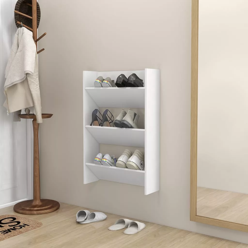 Tartsa cipőt rendezetten és kézközelben ezzel a modern fali cipősszekrénnyel! Egyszerű kivitelezésével könnyedén bele fog illeni meglévő életterébe. A cipősszekrény 3 döntött polccal rendelkezik, melyeken cipőit, csizmáit és papucsait elrendezve tárolhatja. Ez a cipőtartó falra szerelhető, így helyet takaríthat meg, valamint a bejárati terület is rendezett és tiszta marad. Bármely magasságba rögzíthető. Emellett a cipőtartó nedves ruhával könnyen tisztítható.