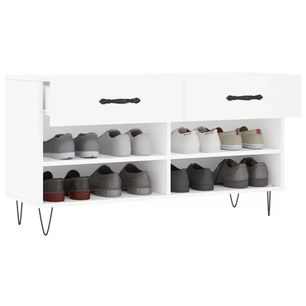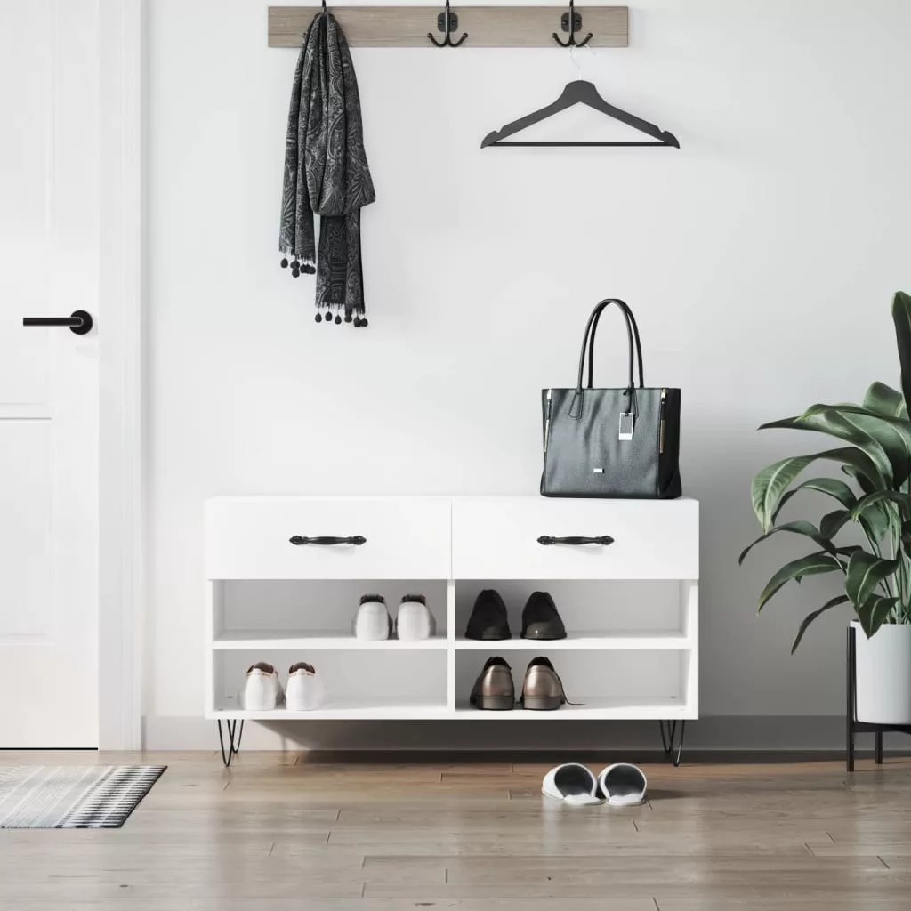 Tárolja cipőit ezen a stílusos és praktikus cipőpolcon. Tökéletes választás cipői rendezett tárolásához. Tartós anyag: A szerelt fa kivételes minőségű, sima felületű, szilárd, stabil, és ellenáll a nedvességnek.Bőséges tárolóhely: A cipőpolcon 2 fiók és 4 polc található, amelyek elegendő helyet biztosítanak cipőinek és egyéb apró tárgyaknak.Robusztus felső lap: A cipőszekrény masszív teteje lehetővé teszi, hogy kényelmesen üljön, miközben le- vagy felhúzza cipőjét.Vaslábak: A vaslábak ipari stílust csempésznek otthonába, és a stabilitásról is gondoskodnak. Figyelem:A felborulás elkerülése érdekében ezt a terméket a mellékelt fali rögzítőeszközzel kell használni. Maximum 110 kg ülésenként.
