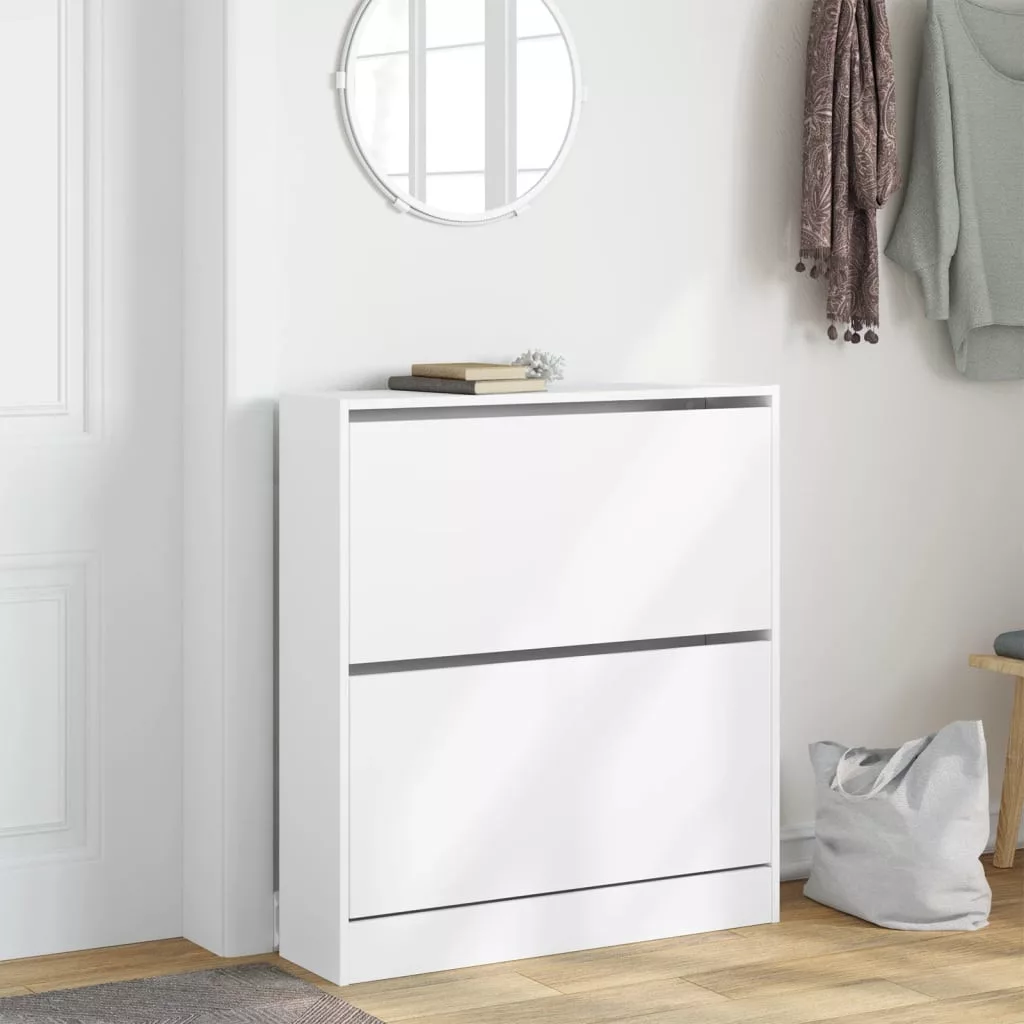 Ez a cipőszekrény kompakt kialakításának köszönhetően kiváló választás cipői rendszerezett tárolására, különösen keskeny és szűk helyeken. Tartós anyag: A szerelt fa kivételes minőségű, sima felületű, szilárd, stabil, és ellenáll a nedvességnek.Bőséges tárolóhely: Ez a cipőtartó 2 kihajtható fiókkal rendelkezik, melyek elegendő helyet biztosítanak a cipők kéznél tartásához és rendezett tárolásához.Praktikus felső lap: A cipőszekrény erős teteje ideális dísztárgyak, például képkeretek vagy cserepes növények elhelyezésére.Helytakarékos kialakítás: A vékony cipőtároló szekrényt úgy tervezték, hogy tökéletesen illeszkedjen olyan kis helyekre, mint az előszoba, folyosó, mosókonyha stb. Figyelem:A felborulás elkerülése érdekében ezt a terméket a mellékelt fali rögzítőeszközzel kell használni.