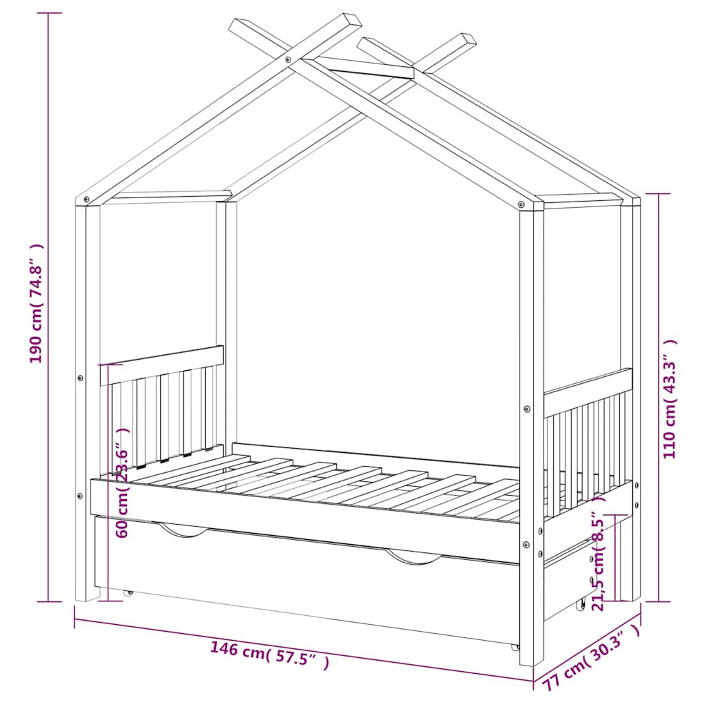 Ez a fiókos fa gyerekágykeret praktikus és dekoratív kiegészítője lesz bármely hálószobának. Az ágy okosan megtervezett faház stílusú kerettel rendelkezik, amelyre ágyfüggönyöket akaszthat, hogy magán szférát biztosítson gyermekének. Olvasósarokként vagy játszóházként is használhatja gyermeke. Ez a tömör fenyőfából készült ágykeret rendkívül masszív és tartós. A masszív lécek biztosítják a szükséges támaszt és kényelmet. A beépített 2 fogantyús ágyfiók bőséges tárolóhelyet biztosít az összehajtogatott ruhák, játékok stb. tárolására, tisztán és rendben tartva a szobát. A könnyen gördülő kerekek szőnyeg- és fapadlón is kiválóan működnek. Ez az ágykeret 70 x 140 cm-es matrachoz alkalmas. Felhívjuk figyelmét, hogy a szállítmány csak ágykeretet tartalmaz, matracot és függönyt nem. Az ágy könnyen összeszerelhető. A hozzá illő matracokat megtekintheti áruházunkban. FIGYELEM. Ne helyezze a gyermekágyat hőforrások, ablakok és egyéb bútorok közelébe. FIGYELEM. Ne használja ezt a gyermekágyat, ha valamelyik része eltört, elszakadt vagy hiányzik.