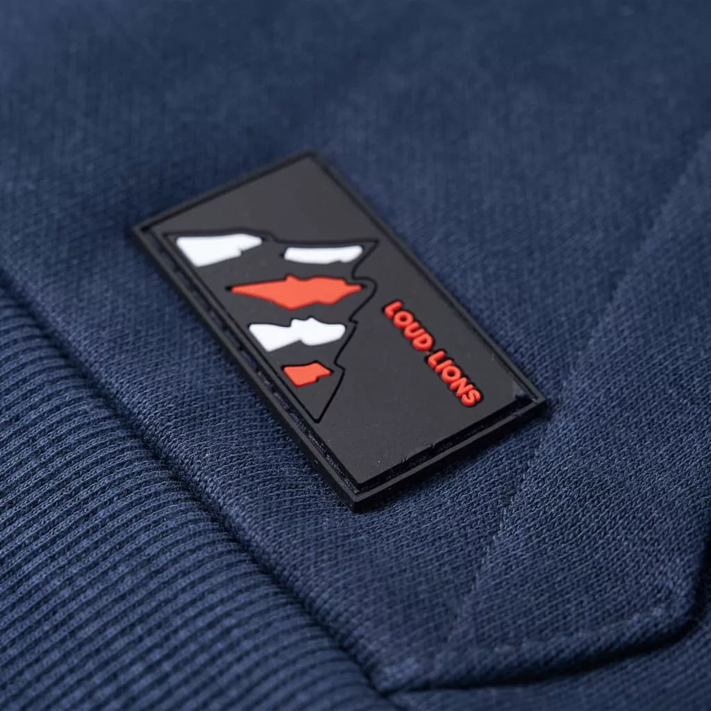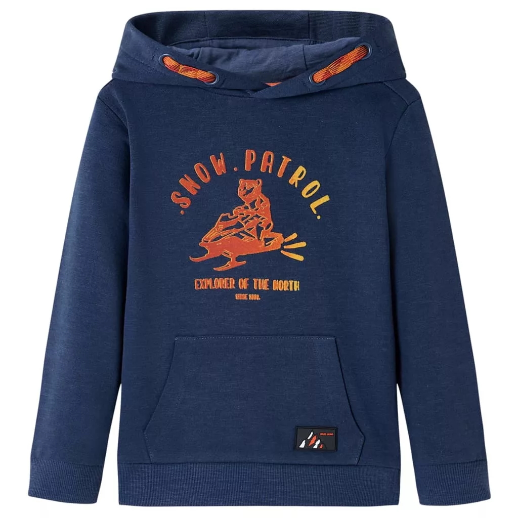 Sötétkék melange és narancs kapucnis gyerekpulóver 116