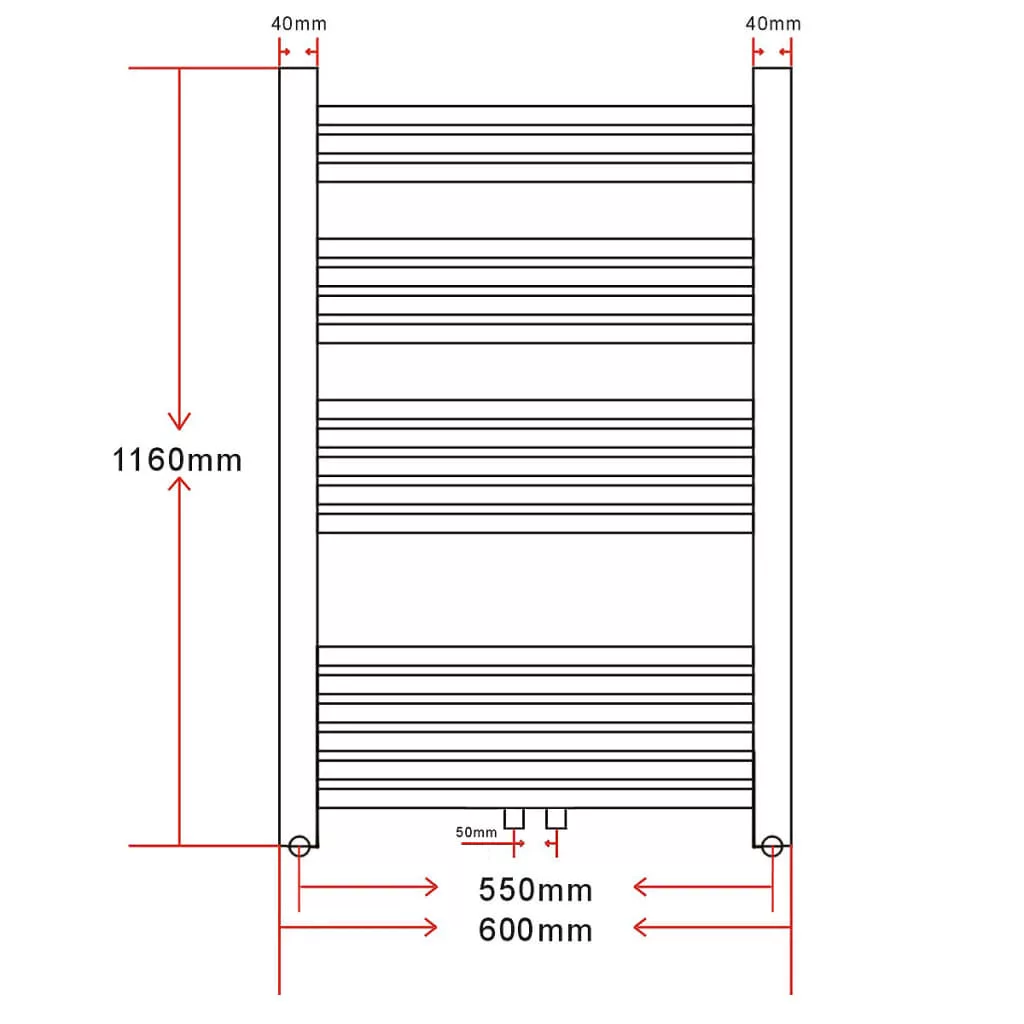 Fürdőszobai törölközőszárító radiátor központi fűtéssel oldalsó és középső csatlakozóval ívelt 600 x 1160 mm