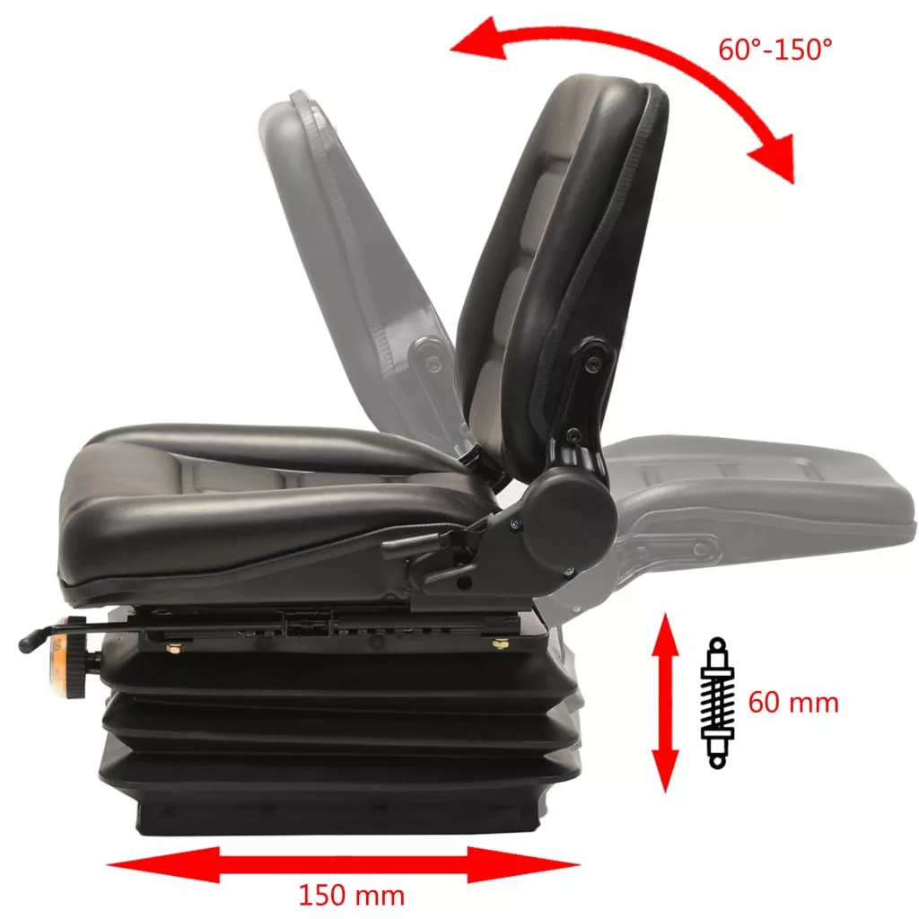 Ez a kiváló minőségű traktorülés targoncához is használható. Erős acélvázzal, illetve strapabíró és vízálló, PVC-ből készült kárpittal rendelkezik. A vastagon párnázott ülőfelületnek és az állítható háttámlának köszönhetően ön a legnagyobb kényelemben dolgozhat traktorján vagy targoncáján. Az ülés 50 és 130 kg közötti személyekre lett tervezve, és a háttámla mögött lévő fogantyúval állítható. A nagy teherbírású felfüggesztés felfogja a rázkódást a földutakon, így a lehető legkényelmesebben dolgozhat traktorjával vagy targoncájával. A traktorülés sínekkel rendelkezik, melyek segítségével 150 mm-en belül előre- és hátrafele mozgatható, a háttámla pedig 60° és 150° között dönthető, tehát mindig megtalálhatja az ön számára kényelmes pozíciót. Könnyen összeszerelhető.