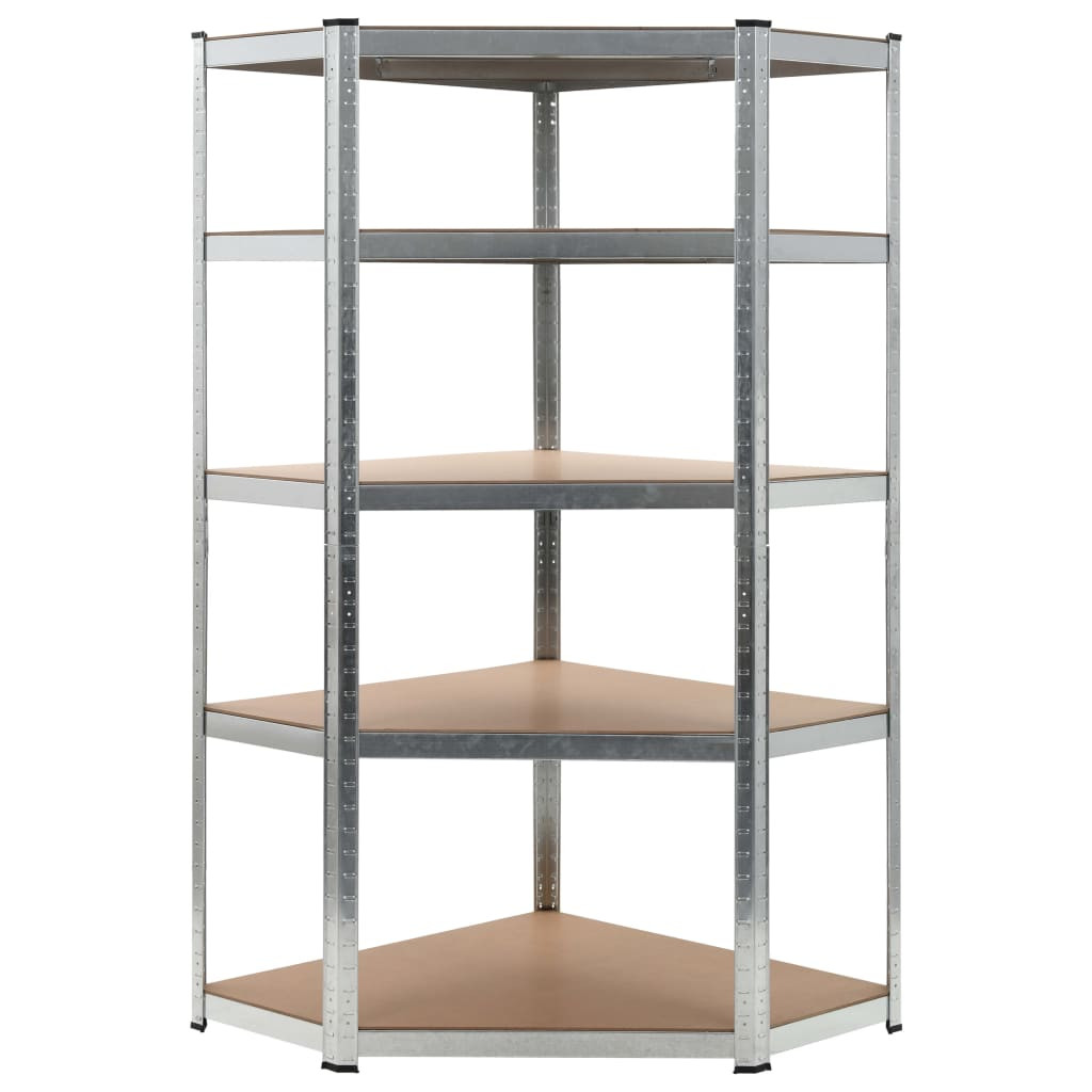 5 szintes ezüstszínű acél és szerelt fa sarokpolc