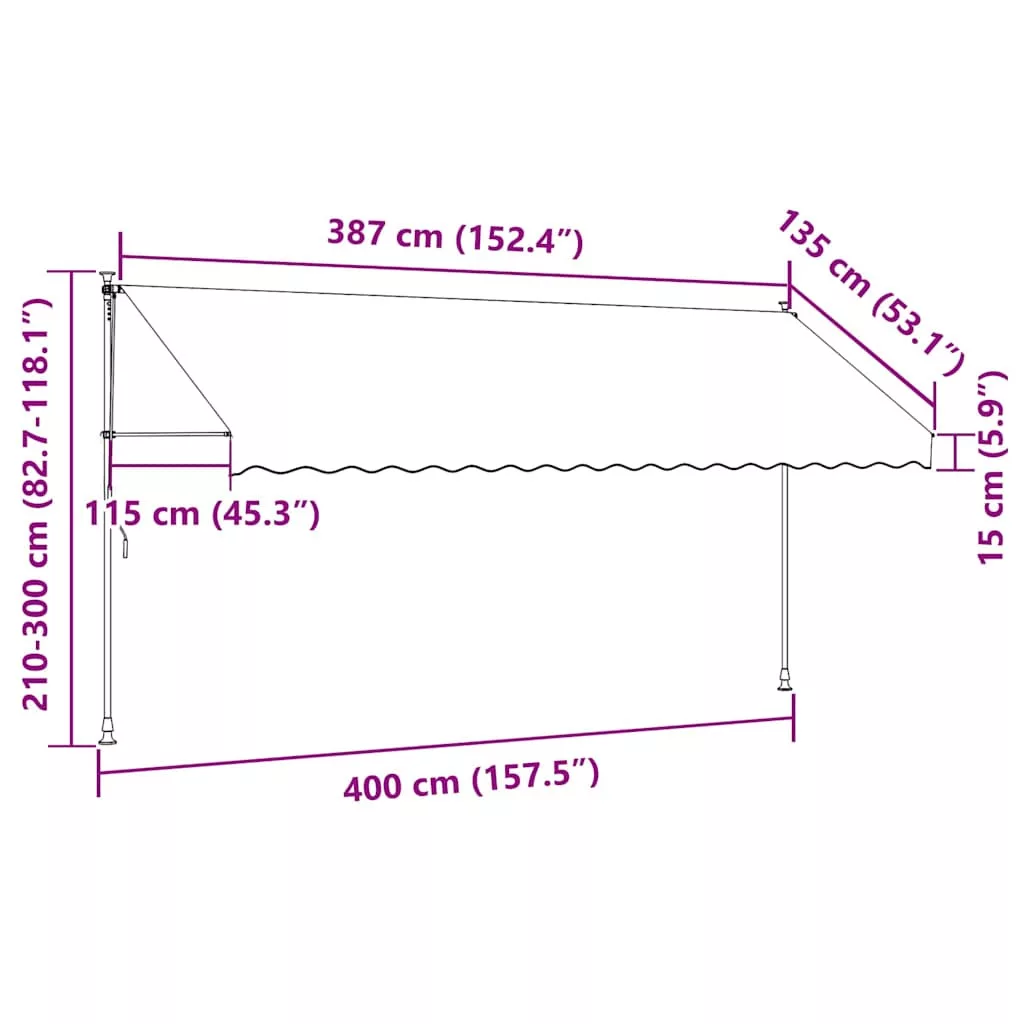 Ez a feltekerhető napellenző tökéletes megoldás ablakok, erkélyek, teraszok vagy kerti helyek árnyékolására. Ez a vízlepergető és kosztaszító, UV- és időjárásálló napellenző kiváló minőségű, poliuretánnal bevont poliészterből készült. Az erős acélváz stabillá és strapabíróvá teszi a szerkezetet. A könnyen tisztítható poliészterszövet levehető és mosható. A fogantyú segítségével a pergola feltekerhető. A szerelési magasság és szög igény szerint állítható. Ráadásul a napelemes LED-lámpák energiatakarékos éjszakai világításként szolgálnak. A napellenző könnyen összeszerelhető. Ez a feltekerhető napellenző tökéletes választás kültéri területek árnyékolására és könnyen, manuálisan működtethető. Soha ne telepítse magas és szeles helyeken, mivel a napernyő leeshet, és sérülést okozhat. A napernyőt be kell húzni, ha a szélsebesség meghaladja a 27 km/h-t.