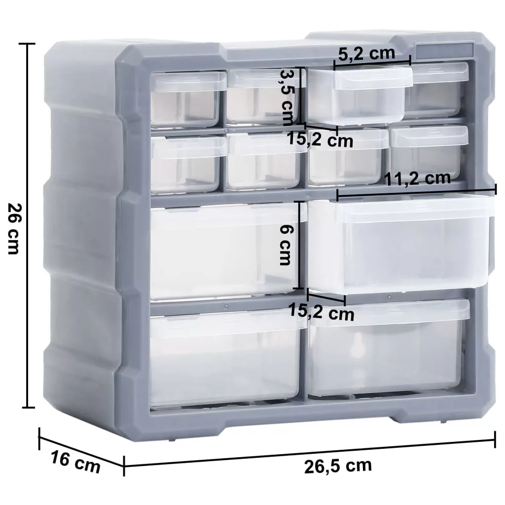 Ezek a nélkülözhetetlen többfiókos szervezők összesen 24 fiókkal rendelkeznek és a legkülönfélébb tárgyak rendezett tárolására szolgálnak. Varróeszközök vagy szögek tárolására is használhatóak. Mindegyik tárolóegység 8 kis fiókot és 4 közepes fiókot tartalmaz az Ön különféle igényeinek kielégítésére. Rendezetten és kézközelben tárolhatja bennük a kéziszerszámokat és a kiegészítőket, például a rögzítőket. A szerszámszekrény ütésálló műanyagból készült, így egyaránt tartós és stabil. A fiókok azonban átlátszó műanyagból készültek, így gyorsan azonosítható a tartalmuk. A szerszámdoboz ideális anyák, csavarok, szegek, általános kellékek és alkatrészek tárolására. Ez a termék falra is szerelhető, és különálló szerszámtárolóként is használható.