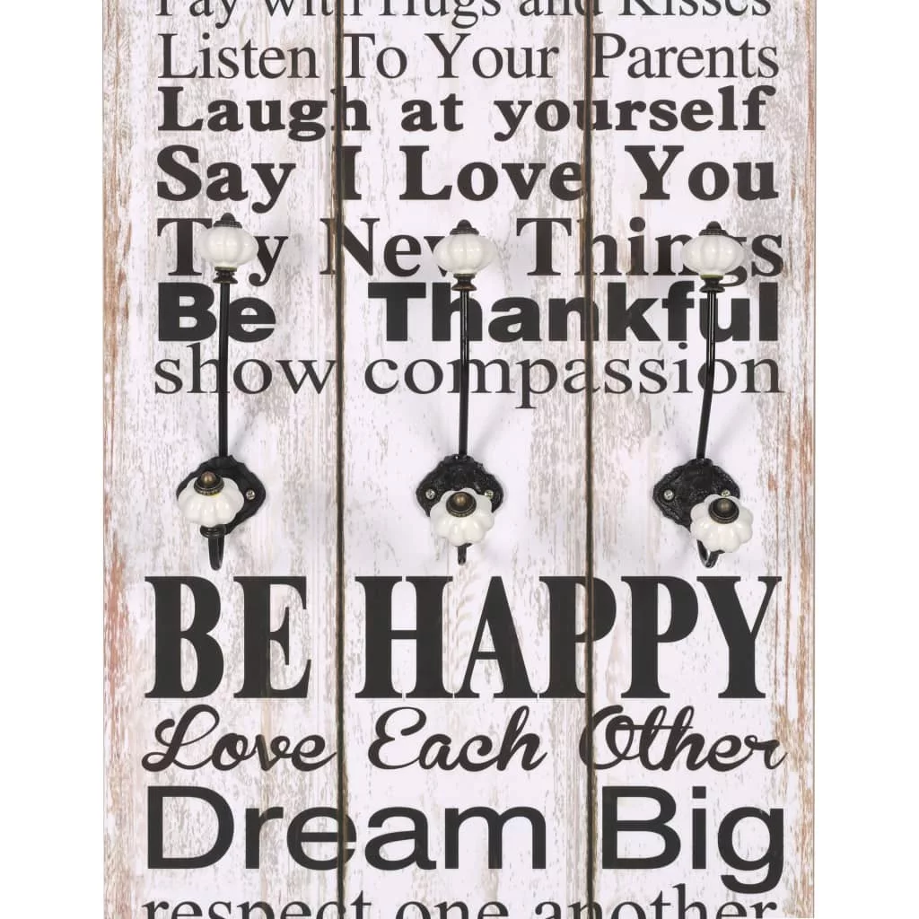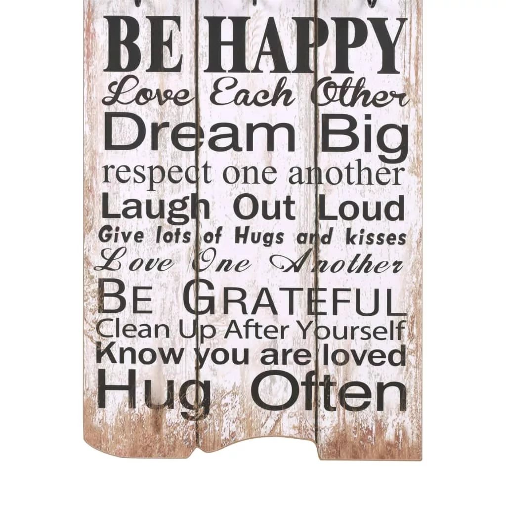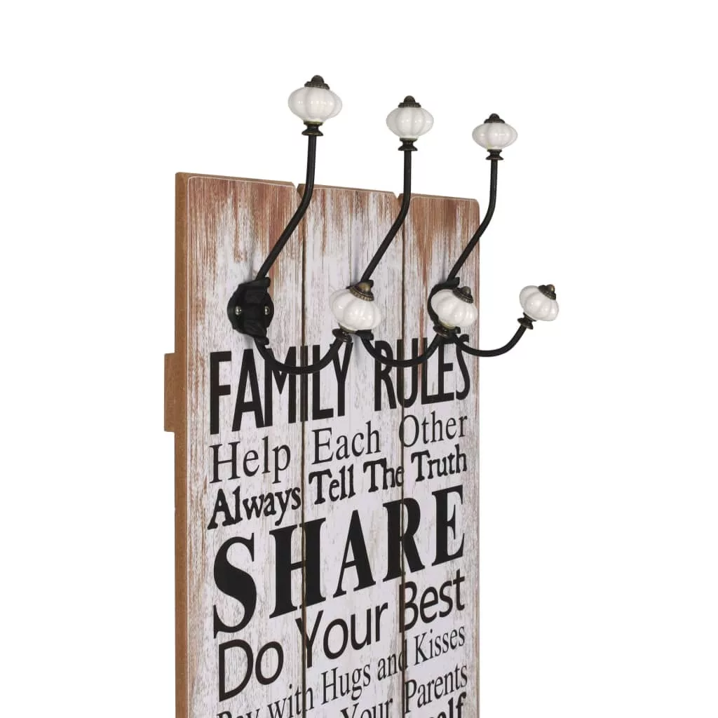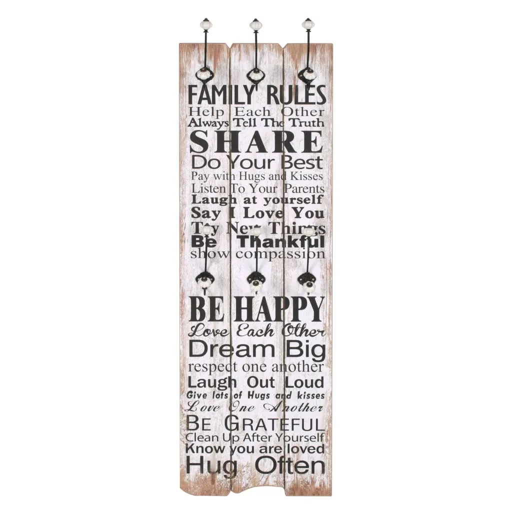 Vintage stílusú grafikája az alábbi feliratot ábrázolja: „Family rules Share Be happy Dream big Hug often”, így a 6 akasztóval ellátott ruhafogas rendkívül mutatós kiegészítője lesz otthonának, amire rögtön felkapják a fejüket a vendégek is. A fogas MDF-lapból készült, melynek köszönhetően rendkívül strapabíró. A három pompás fém akasztó két sorban van elrendezve, így a fogas bőséges helyet kínál kabátok, táskák, sálak, kalapok és egyéb kisebb kellékek számára. Két rögzítési ponttal rendelkezik, így könnyedén a falra szerelhető. Könnyen összeszerelhető. A szállítás tartalmazza a felszereléshez szükséges tartozékokat.