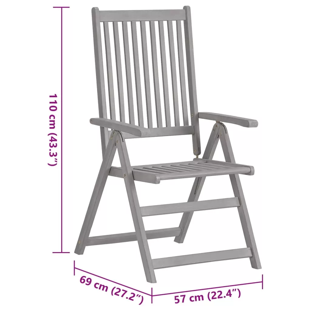 Ez a divatos, párnával ellátott, kerti dönthető szék szett extra kényelemmel ruházza fel külterét! Ezek a karosszékek tömör akácfából készültek, amely egy sűrű erezetű keményfa, valamint szürke felületet kapott. Ezek a gyönyörű kialakítású kültéri székek stabilak, tartósak és figyelemfelkeltőek. A szék háttámlája 5-féle pozícióba dönthető, így mindig a legkényelmesebb helyzetbe állíthatja, saját igényeinek megfelelően. Sőt, a mellékelt párnák további kényelmet nyújtanak pihenés vagy étkezés közben. A párnák egy-egy elasztikus pánttal és két-két kötözővel lettek ellátva, melyekkel a székekhez rögzíthetőek. Ezek a székek kiválóan alkalmasak a családjával töltött étkezésekhez vagy egyszerűen csak élvezni a jó időt a kertben. Maximum 110 kg ülésenként.