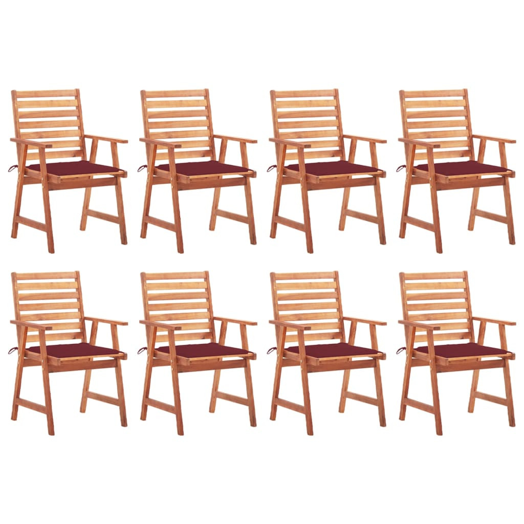 Párnával ellátott modern fa étkezőszékszettünk természetes stílust csempész a kertjébe, teraszára vagy verandájára. Ez a fa székszett nagyszerű választás a szabadtéri étkezéshez. A kerti székek tömör akácfából, egy trópusi keményfából készültek, amely időjárásálló és hosszú éveken keresztül használható. Az olajjal kezelt felület nedves ruhával könnyen tisztítható. A rácsos kialakítás rusztikus bájt kölcsönöz a székeknek, a mellékelt párnák pedig extra kényelmet biztosítanak. 100% poliészterből készült, amely vízálló. A párnákat két kötél rögzíti szorosan a székekhez. Megjegyzés: Kültéri bútora élettartamának meghosszabbítása érdekében javasoljuk, hogy védje vízálló huzattal. Maximum 110 kg ülésenként.